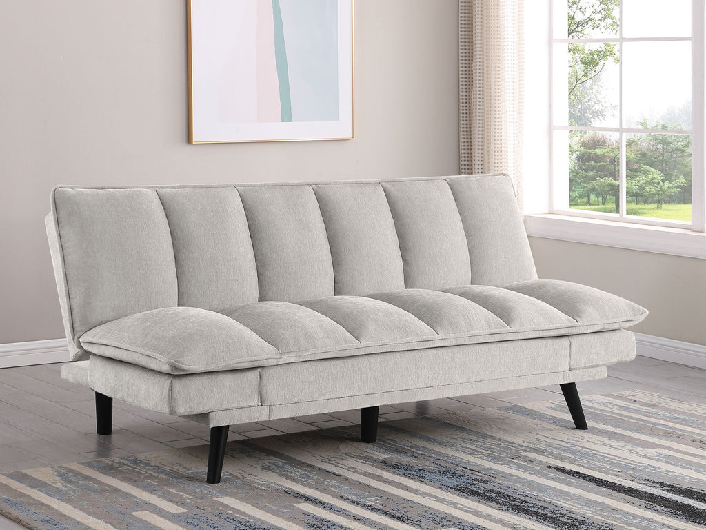 Versatility reigns in a modern sofa bed. Soft upholstery complements perfectly, bringing inviting style to a convertible design. It goes from sofa to bed with a lay-flat mechanism, perfect for a multi-functional space like a home office or compact living room. Tufting adds a sense of structure to the design. Splayed legs receive a black finish, offering a chic look against lighter upholstery.