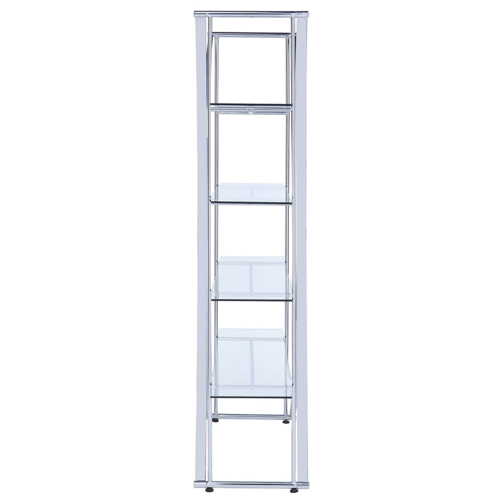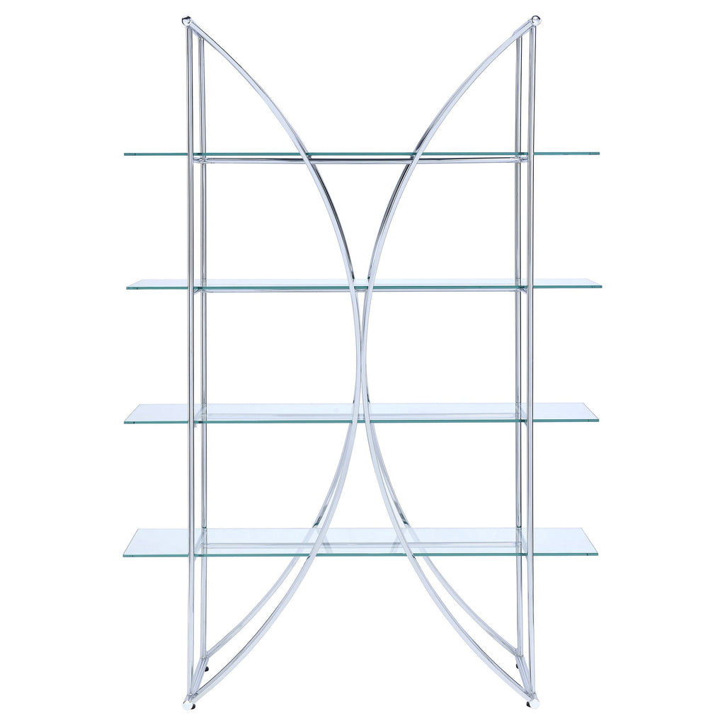 The ultimate in contemporary design rests in this eye-catching bookcase. Modern architecture meets art in a compelling silhouette blending arc-shaped and linear steel frames with clear tempered glass shelves. Four tiers offer ample space for displaying books, decor, and potted greenery. A fresh chrome finish adds luster to a tastefully designed contemporary space. Energize a modern room with a subtle yet tasteful bookcase.