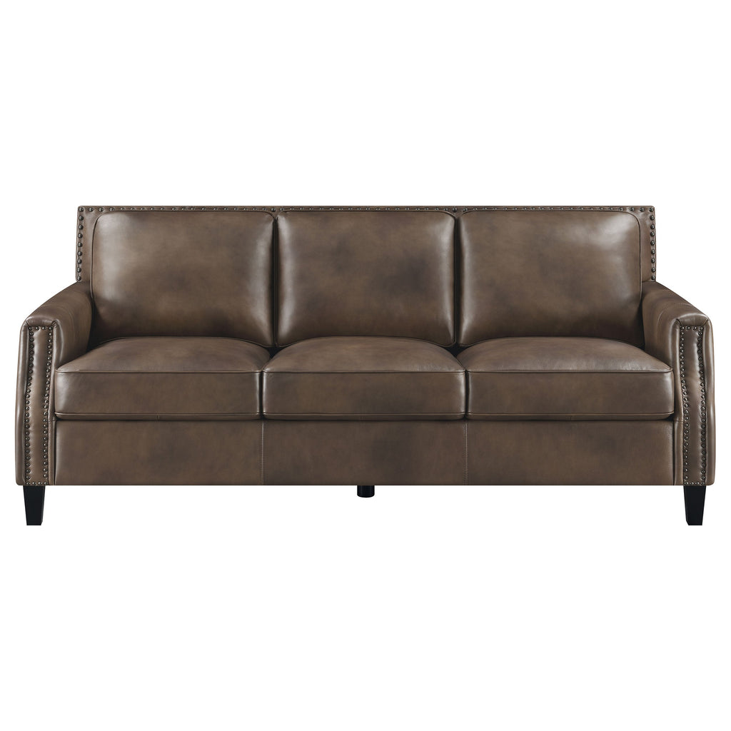 Wrapped in a smooth mottled top grain leather in a warm brown sugar hue, this seating set lends a neutral tone that complements a living room's existing color palettes. Perfectly suited for a modern farmhouse home, this seating set offers many transitional elements such as sleek recessed arms that gently slope off toward the front. Along each arm interior facade and backrest are individually hammered nailheads in an antique brass finish. Plush back cushions and tailored boxed seats offer long-lasting support and comfort for family and guests. In addition, matching welt trim lines each cushion, adding a classic look.