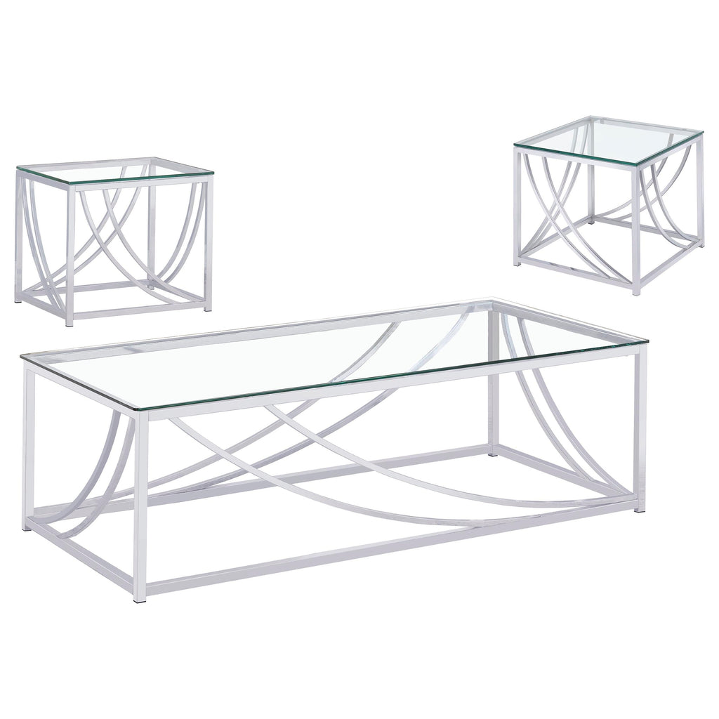 This coffee table set, including a cocktail table and end table, blends sleek modern design with practical functionality. Both pieces feature clear tempered glass tops and electroplated polished chrome frames. The curved metal accents add a contemporary, elegant touch to the design. Built with sturdy metal construction, this set is durable and stylish, making it a perfect addition to any living room or seating area.