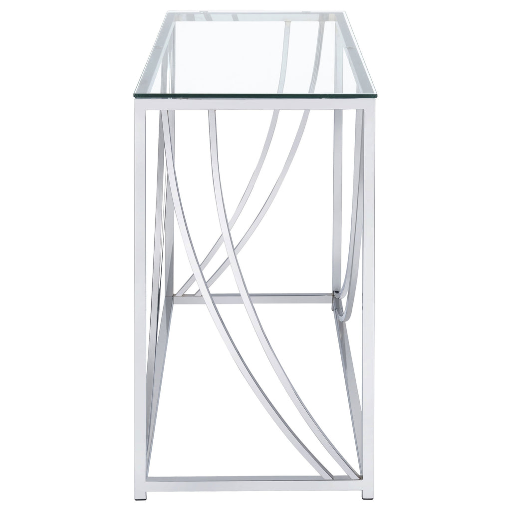 This rectangular console table combines modern elegance with practical design. Featuring a clear tempered glass top, it offers both durability and style. The electroplated chrome frame adds a sleek, polished finish, while gracefully curved metal accents enhance its sophisticated look. Ideal for placement in hallways, entryways, or behind a sofa, this table blends function with form, providing a stylish surface for display or storage in various living spaces.