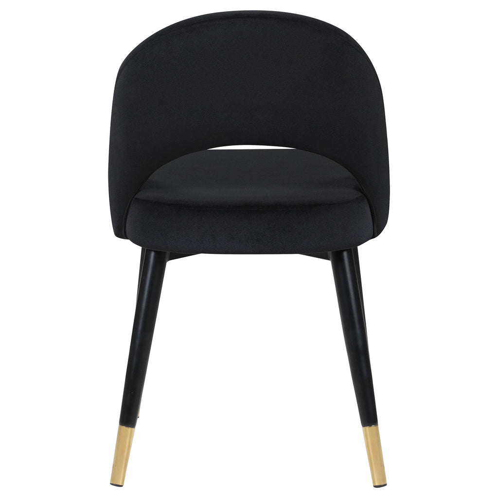 Add a touch of retro-inspired elegance to your dining room with this stylish dining side chair, featuring an elegant bucket-style seat that embodies Mid-Century modern charm. Wrapped in luxurious velvet, each chair provides a supportive, long-lasting seating experience, making it perfect for hosting dinner guests or enjoying a cozy meal. The flared, tapered legs, finished with dramatic gold-capped feet, add a regal Hollywood glam touch that enhances any dining space. This versatile chair effortlessly complements various color palettes and brings a bold statement to both formal and casual settings. Pull these chairs up to a spacious rectangular dining table to create an inviting and chic atmosphere for any gathering.
