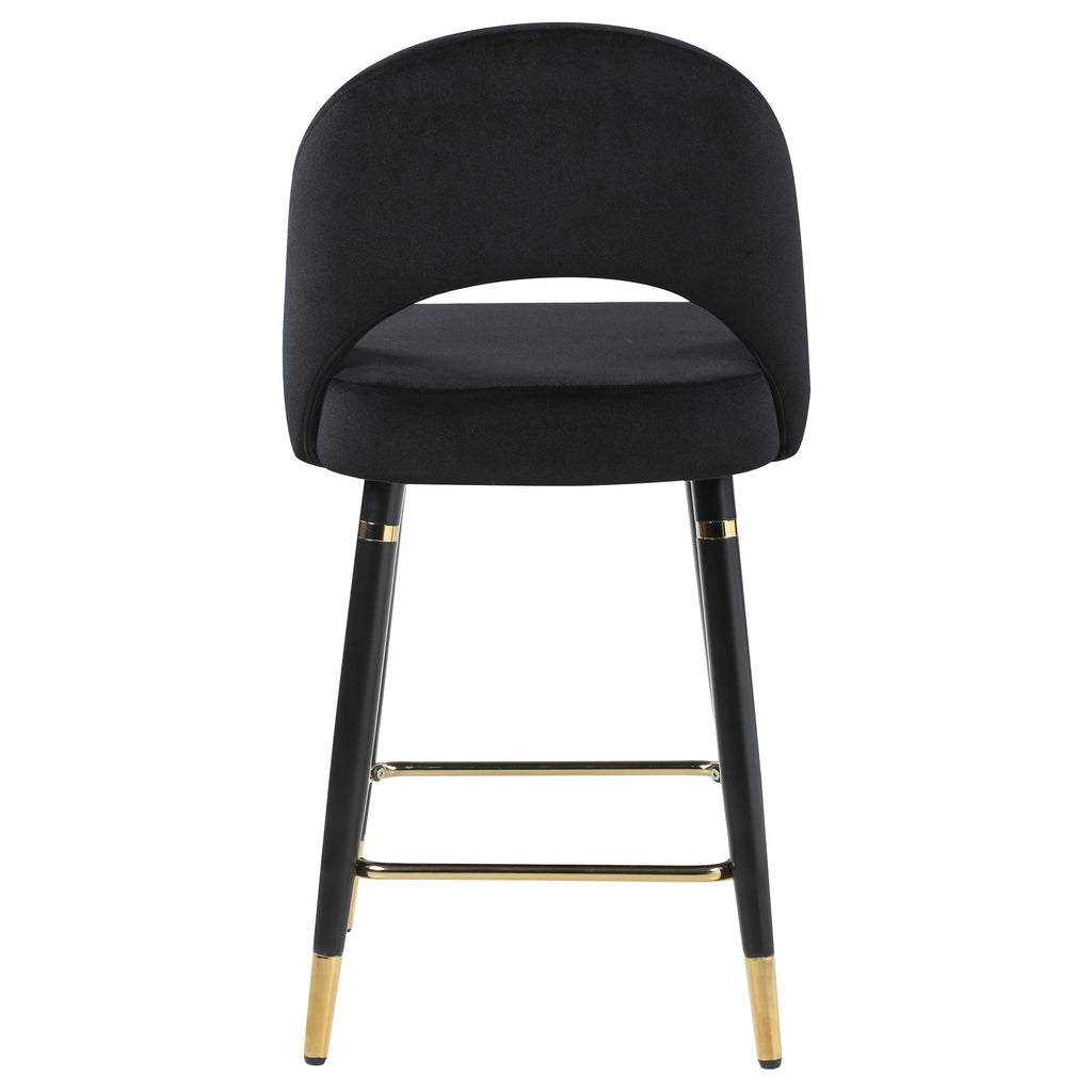 Add a touch of retro-inspired elegance to your dining area with this stylish counter height chair, featuring an elegant bucket-style seat that embodies Mid-Century modern charm. Wrapped in luxurious velvet, each chair provides a supportive, long-lasting seating experience, perfect for casual dining or entertaining guests. The flared, tapered legs, finished with dramatic gold-capped feet, bring a regal Hollywood glam touch that enhances any space. This versatile chair effortlessly complements various color palettes and serves as a bold statement piece in both formal and casual settings. Pull these chairs up to a counter height dining table or kitchen island to create an inviting and chic atmosphere for any occasion.