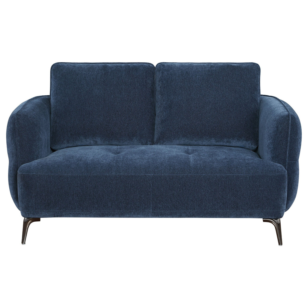 Enhance your living space with this elegant loveseat, designed to capture attention from every angle. With its beautifully curved design and alluring back profile, this loveseat offers both style and comfort. The deep blue upholstery adds a touch of luxury, while the black nickel legs provide a modern and sturdy foundation. This loveseat is perfect for creating an inviting atmosphere in any room, combining contemporary aesthetics with cozy seating.