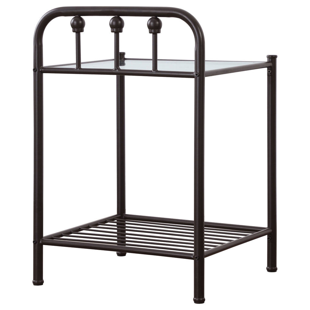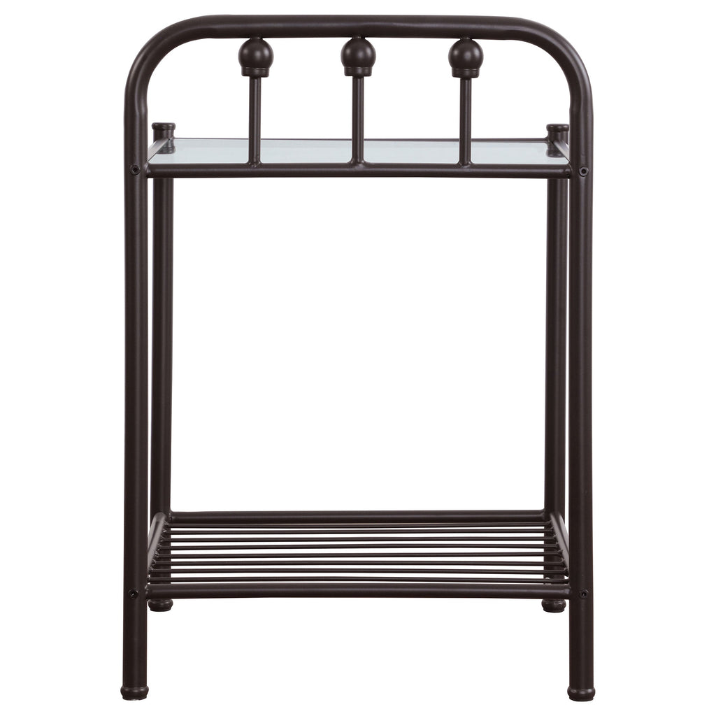 This metal nightstand brings farmhouse charm and functional design to your bedside. Crafted with a dark bronze powder-coated frame, it features a clear tempered glass top for open visibility and easy cleaning. A lower slatted metal shelf adds extra storage for books or essentials. With its vertical rod accents and rounded corners, this table offers durability and vintage character for any bedroom space.