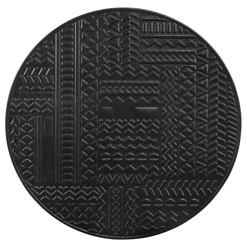 Add a modern rustic touch to your space with this two-piece nesting table set, designed for style and function. Crafted from eco-friendly solid mango wood, the embossed tribal-inspired ink blot pattern on the round tabletops adds a textured global aesthetic. Supported by slim black iron bases with a cage-like silhouette, these tables offer an airy and lightweight feel. Ideal for small spaces, the smaller table conveniently nests under the larger one, making it perfect for versatile living areas. Whether used together or separately, this contemporary set blends organic charm with industrial edge.