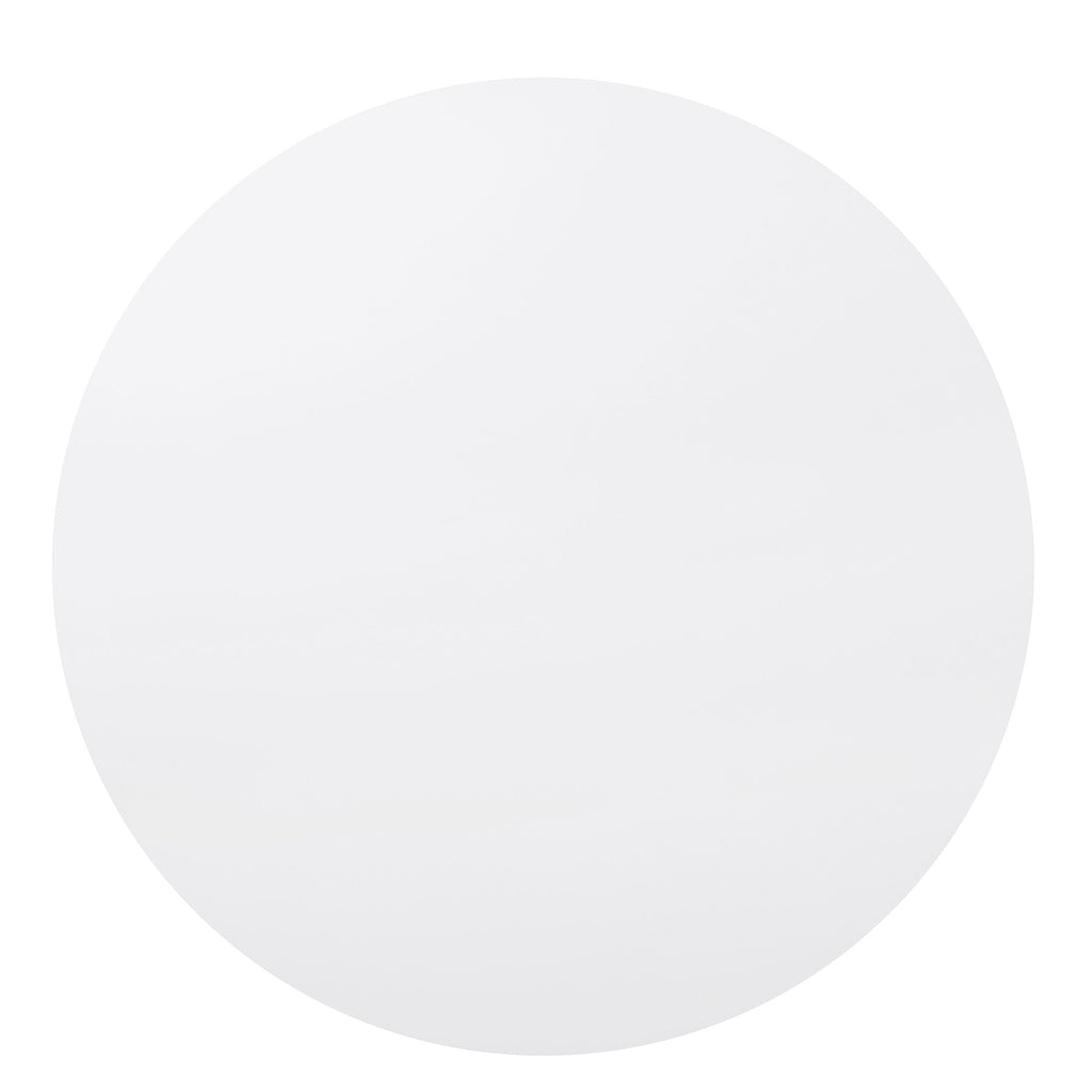 Round table with a pedestal style base and metal construction with powder-coated finish