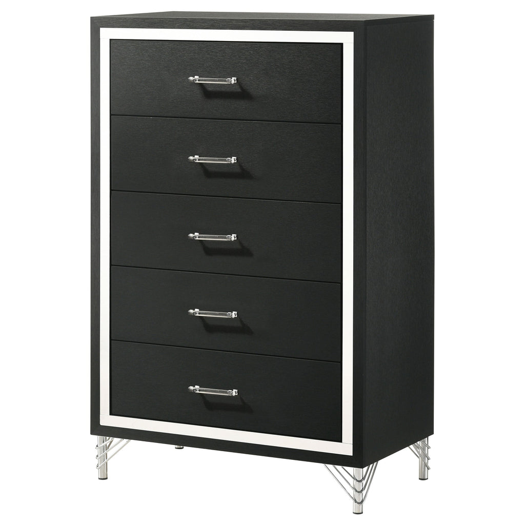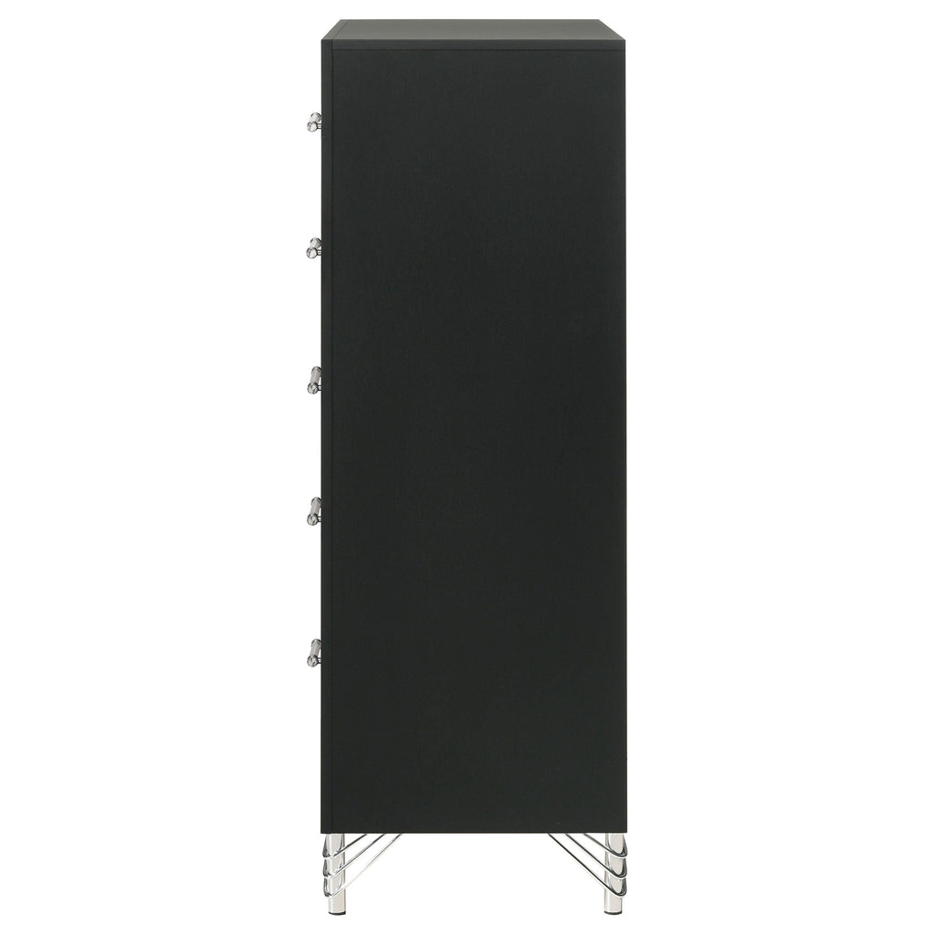 Inspired vintage touches create a refined sensibility for a modern five-drawer chest. Its tall, compact profile is ideal for a dressing area, offering plenty of storage with five roomy drawers that host everything from clothing and accessories to linens and other personal effects. The chest shows off a bold black finish, complete with gleaming chrome trim that adds coolness and elegance. Its long bar drawer pulls add character, while hair pin inspired legs bring retro glamour and sophistication. Add decor to the top for a personal touch in your bedroom.