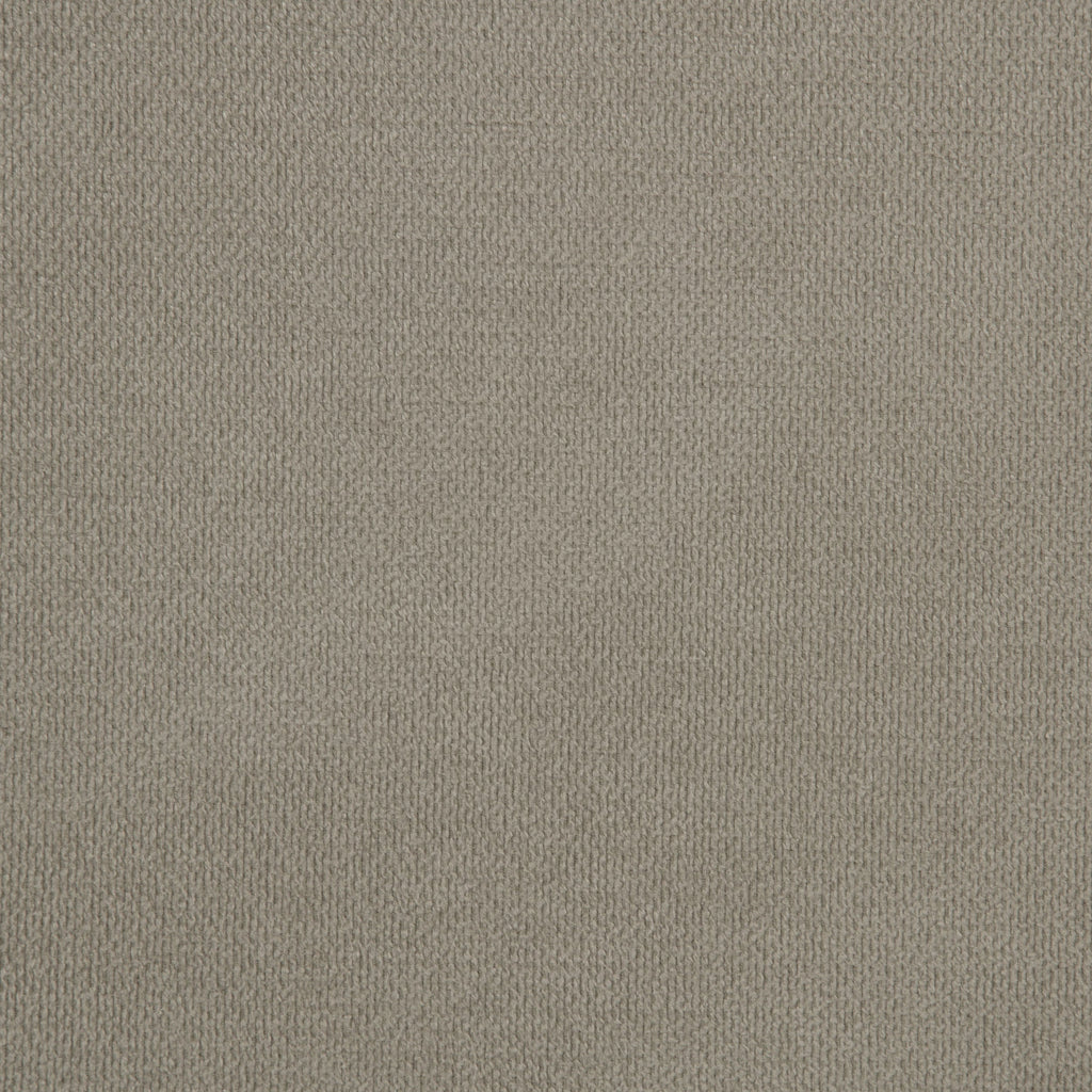 Upholstered headboard features rounded corners and padding under taupe fabric
