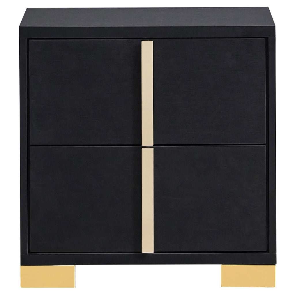 A bold look leans exotic and alluring to transform your master or guest bedroom into an inviting venue. Modern design details produce a chic nightstand with an Art Deco vibe and tons of elegance. Made of wood products, this two-drawer nightstand features a versatile finish with accenting from gold finish metal, placed carefully to emphasize a geometric linear effect. Store incidentals and accessories in two drawers operating smoothly on center metal glides. English dovetail drawer construction embellishes this nightstand’s quality, as vertical gold metal hardware offers a unique impact.