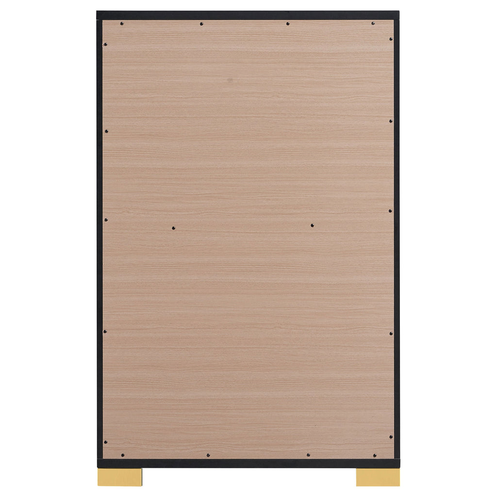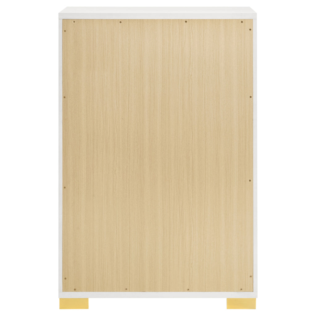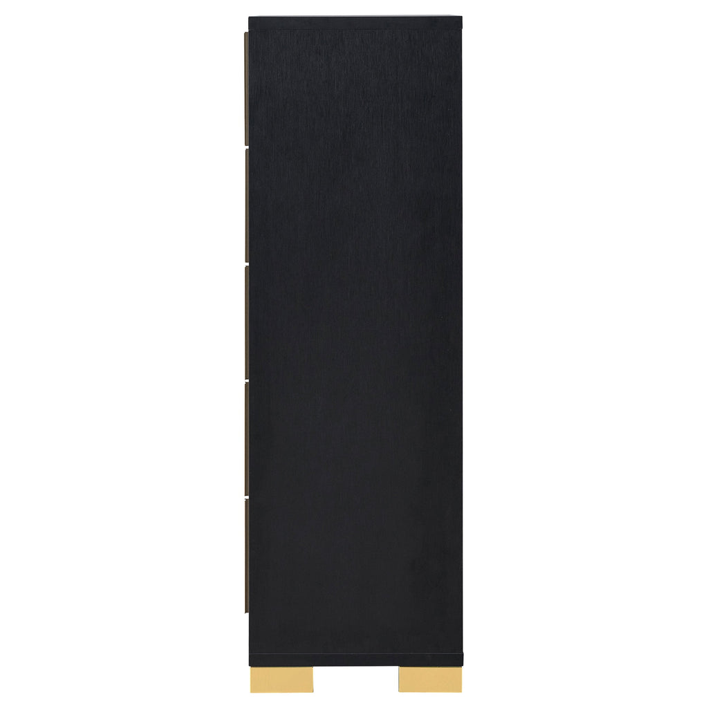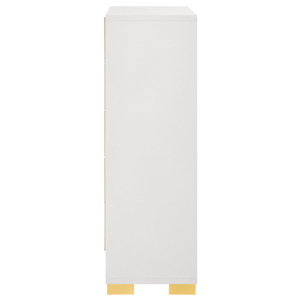 Minimalism never looked so elegant as it does in this elegant five-drawer chest, an excellent option for your updated bedroom ensemble. Modern design details produce a chic vertical chest with an Art Deco vibe and tons of storage space. Made of wood products, this five-drawer chest features a versatile finish with accenting from gold finish metal, placed carefully to emphasize a geometric linear effect. Store incidentals and accessories in drawers operating smoothly on center metal glides. English dovetail drawer construction embellishes this chest’s quality, as vertical gold metal drawer hardware offers a unique impact.