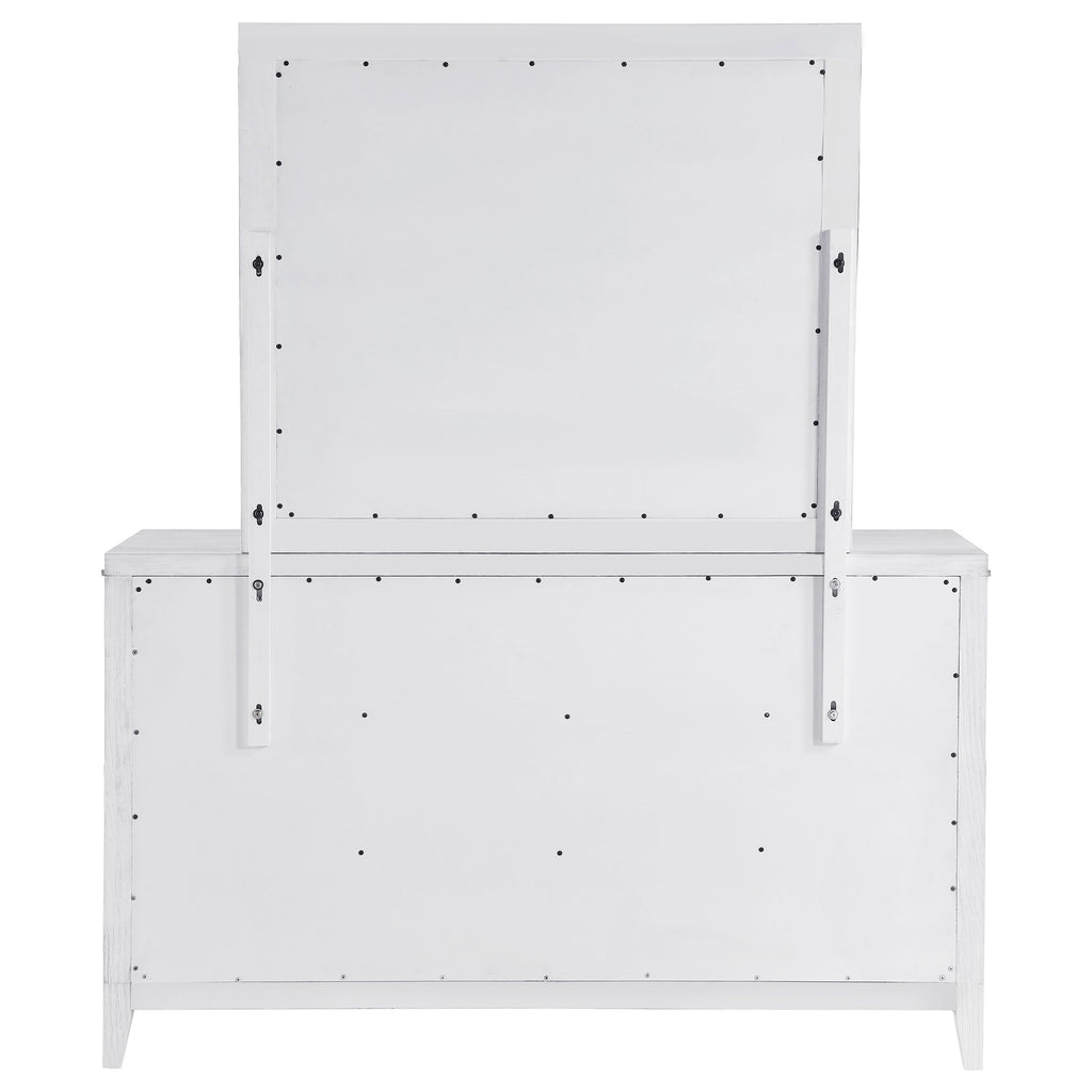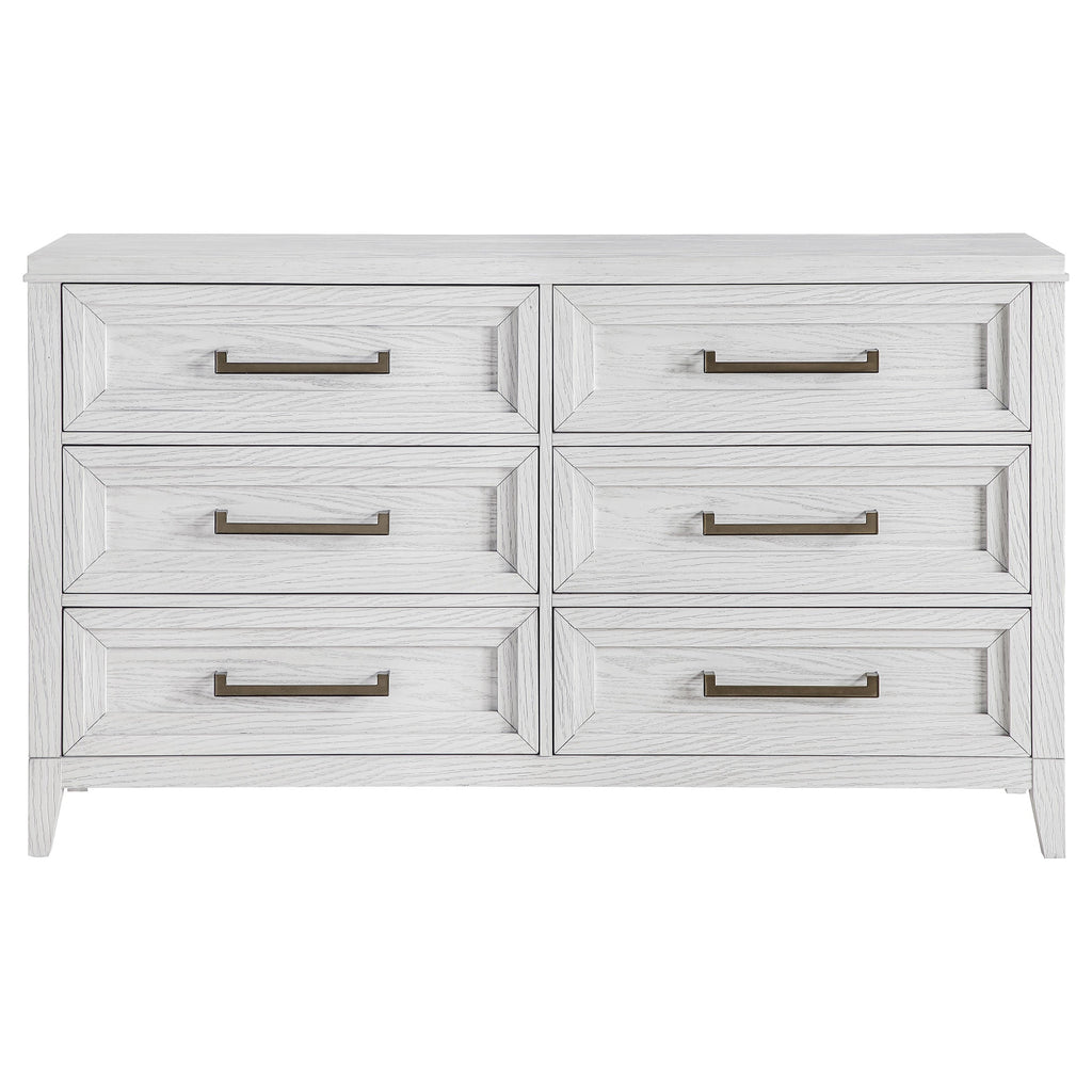 Light distressing offers depth and dimensionality to a modern six-drawer dresser. Perfect for clothing and other accessories, it features a double profile with three drawers on each side. A white finish allows wood grain details to show through, creating organic character and texture. Drawer fronts are a stepped design that adds artistry, with long antique brass toned pulls that add contrasting depth. use the wide top for personal effects like a jewelry box or valet and framed photos.