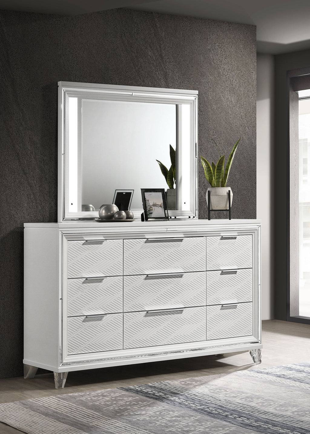 Elevate your bedroom decor with this stunning dresser and mirror set, featuring a modern Italian design with a striking white finish. The dresser offers ample storage with nine drawers, picture framed recessed panels, and embossed herringbone graphic patterns, while the mirror adds a touch of sophistication with its mirror framing and touch LED light. Accented with polished chrome metal hardware and acrylic legs, this set combines style and functionality. Crafted from Asian hardwood, MDF, and mirror, this dresser and mirror set is a perfect addition to your luxurious bedroom.