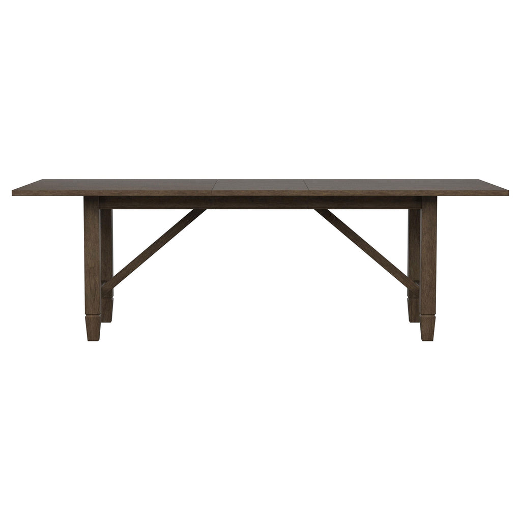Create a soothing, relaxed ambiance in your welcoming dining room with a transitional five-piece dining set. The set centers on a rectangular table crafted in Asian hardwoods and graced with a warm, neutral brown finish. Angular support details add trestle-inspired style for a hint of farmhouse flair to the table, which includes an extension leaf for guests. Four side chairs are included, each boasting a matching wooden frame with a plush padded seat in neutral beige upholstery. Rectangular seat backs add rattan, bringing airy appeal and casual character in a kitchen or dining room.