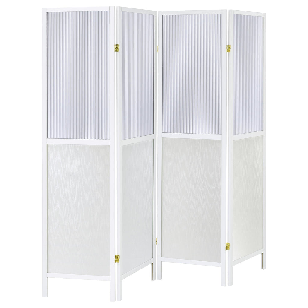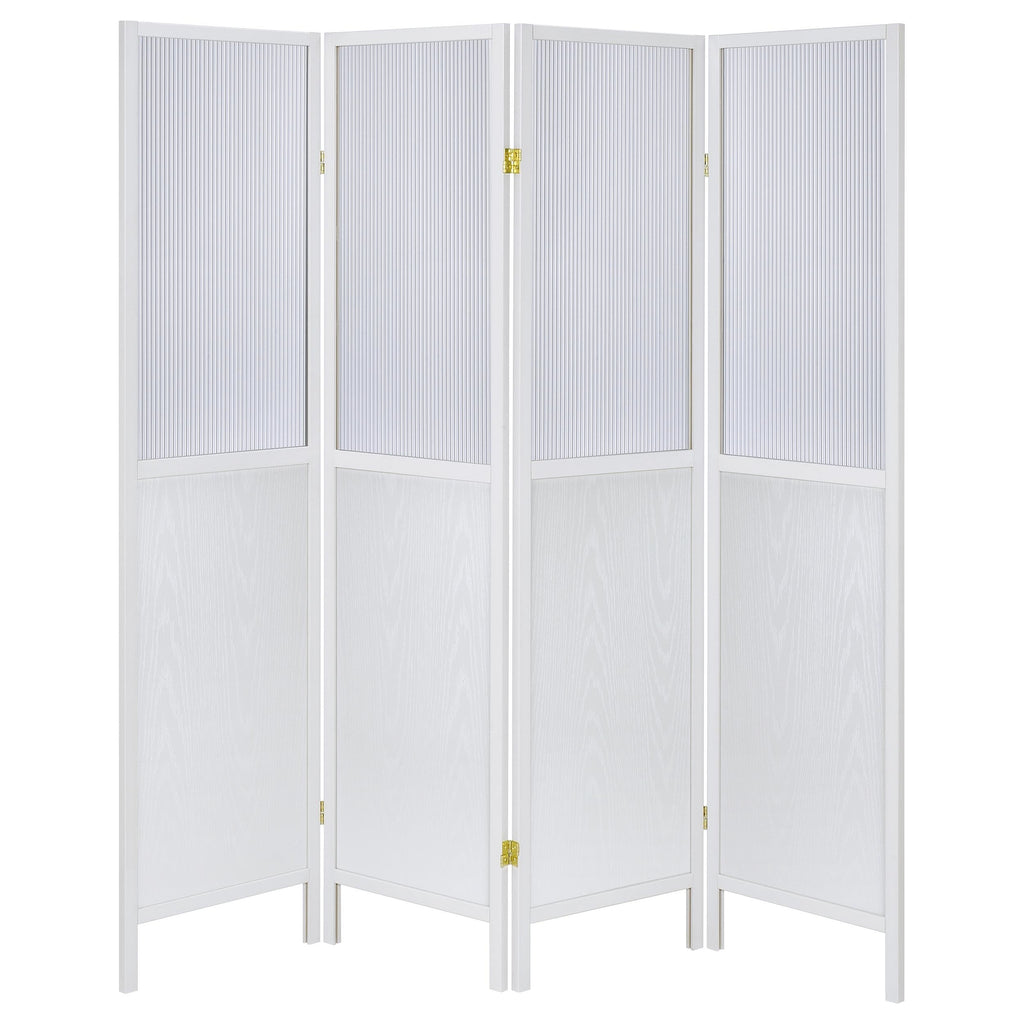 Create the perfect sense of division in your open living space with a transitional four-panel room divider. The freestanding piece offers four tall panels, each divided with a semi-opaque top section that allows light to pass through. The panels are ideal for a large master bedroom, creating a sense of privacy for dressing or to section off a desk. The frame of each panel features a neutral finish and a solid lower panel for excellent performance and privacy. The lower panels includes a wood grain finish that's subtle, offering a touch of dimension to any room.