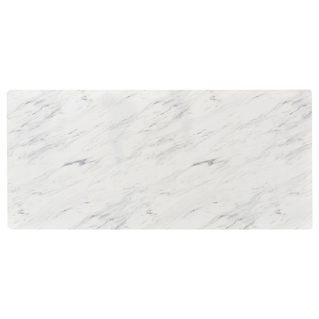 With a white marble-inspired tabletop design, this modern dining table creates a classical look to a space. Timeless traditional elements are contrasted by an asymmetrical metal base, featuring a singular diagonal trestle leg and two separate angled legs. The striking base offers a powder coated gunmetal finish for extra durability and resistance. The sleek and spacious tabletop offers seating for up to six guests too. Place this ultra-modern dining table in a formal dining area.