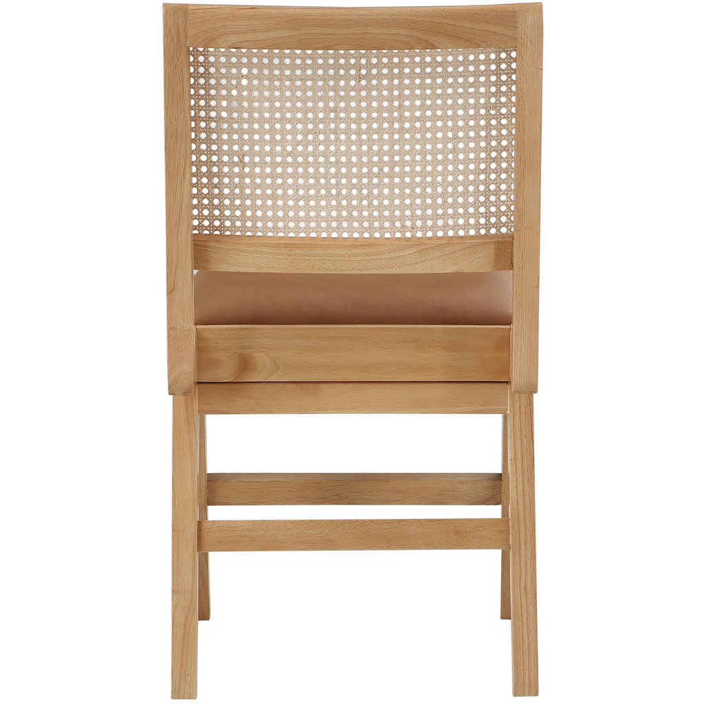 Sit back and relax in this side chair from Meridian Furniture's Abby collection. Featuring a frame crafted from solid wood with a natural finish and a cognac vegan leather seat, this chair is both sturdy and durable so it will last you for years to come. A natural cane backrest seamlessly blends with the chair's natural-finished frame, adding a sense of warmth and charm that ensures it will stand out among all your furniture.