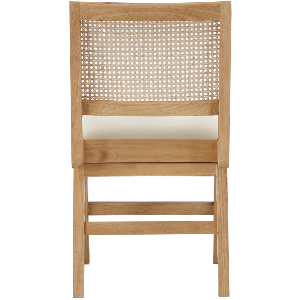 Sit back and relax in this side chair from Meridian Furniture's Abby collection. Featuring a frame crafted from solid wood with a natural finish and a cream vegan leather seat, this chair is both sturdy and durable so it will last you for years to come. A natural cane backrest seamlessly blends with the chair's natural-finished frame, adding a sense of warmth and charm that ensures it will stand out among all your furniture.
