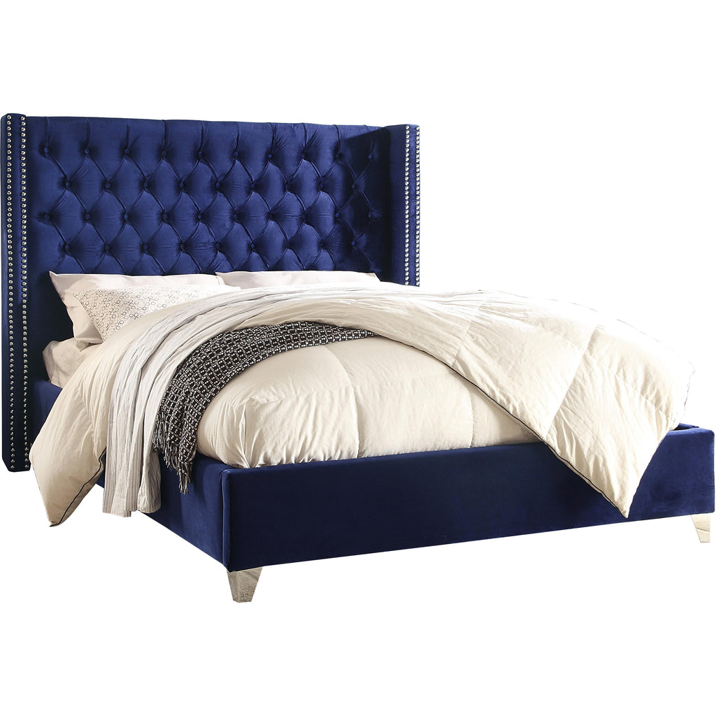 Elegant and eye-catching, the stunning Aiden Bed from Meridian Furniture is the perfect addition to any bedroom. Rich velvet covers the deep tufted design. A beautiful wing bed design is complimented by hand applied chrome nail head details. Strength and beauty is guaranteed with a solid wood frame and stainless steel legs.