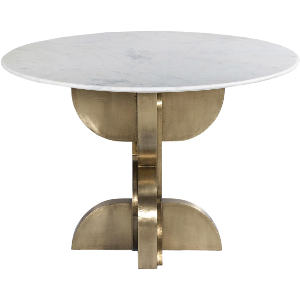 The Alden White Dining Table is an exquisite piece that will effortlessly elevate the interior decor of your dining room. Its genuine marble top exudes luxury, while the brass finish metal sheet base adds a touch of elegance to the overall look. Its stunning and unique design is sure to catch the eye of your guests, leaving them in awe. This remarkable piece is perfect for creating a warm and inviting atmosphere in your home.