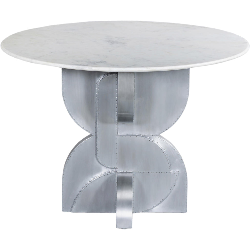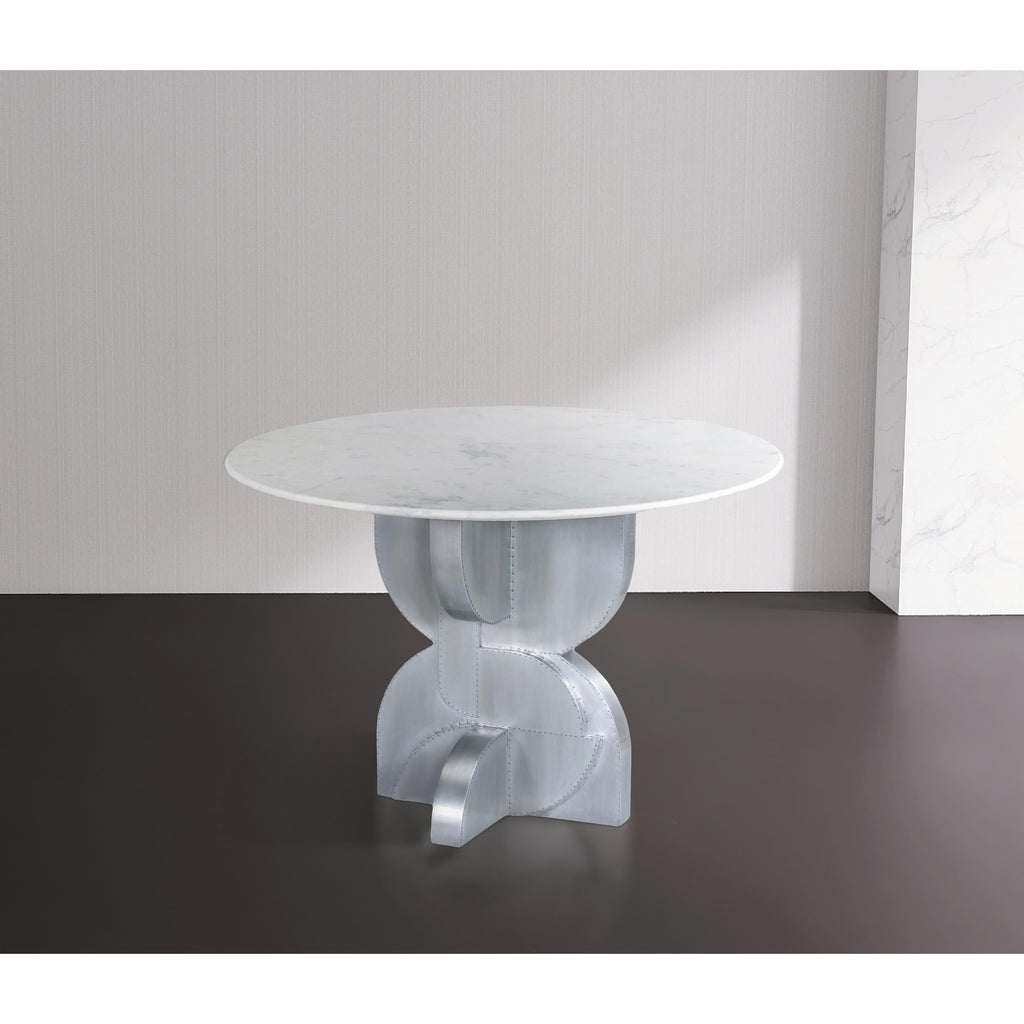 The Alden White Dining Table is an exquisite piece that will effortlessly elevate the interior decor of your dining room. Its genuine marble top exudes luxury, while the silver finish metal sheet base adds a touch of elegance to the overall look. Its stunning and unique design is sure to catch the eye of your guests, leaving them in awe. This remarkable piece is perfect for creating a warm and inviting atmosphere in your home.