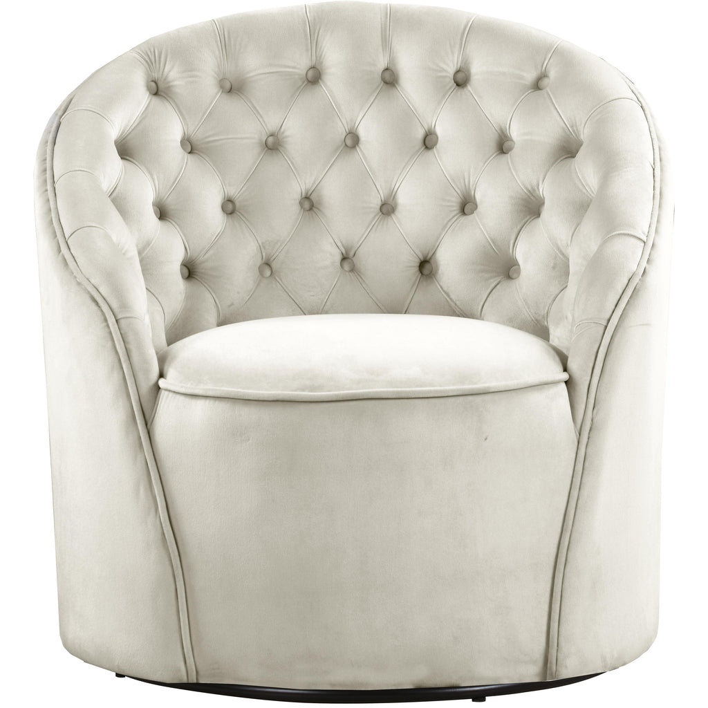 Give your living space a sophisticated makeover with this Alessio Cream Velvet Swivel Accent Chair from Meridian Furniture. This swivel base accent chair has luxurious cream velvet upholstery that provides you with a soft, comfortable place to sit while you cozy up with your favorite book or curl up in front of your favorite TV show or movie. Deep button tufting on the inner back adds to its contemporary design, making it the perfect addition to any room in your home.