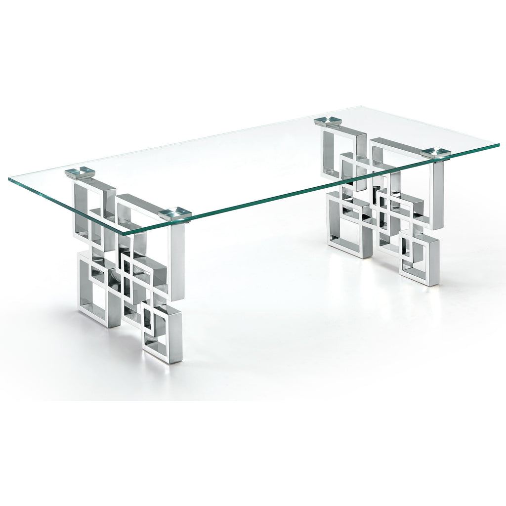 Enjoy a contemporary look in your living room or den with this stylishly elegant Alexis chrome coffee table. This Meridian Furniture table is made from glass and metal for a sleek, modish look. The base features a geometric design with intertwined squares that form two pedestals. The top is crafted from thick, clear glass that allows the beauty of the base to shine through completely. A chromed finish shores up the design, adding to its up-to-the-minute feel.