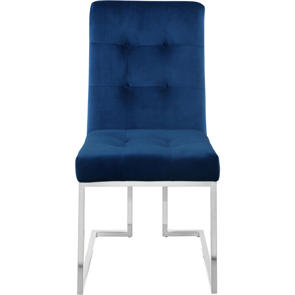 Dine in sophistication and elegance when you're seated in this Alexis navy velvet dining chair. This pretty chair has a modish look that's suitable for nearly any contemporary decor theme. The base is made from stainless steel and has been given a rich chrome finish that lends it added modern panache. The seat is thickly padded and welcoming to the body as you sit through mealtime and converse with family and friends. Plush navy velvet upholstery with tufting on the back and seat cushions finishes off the design on a svelte note.