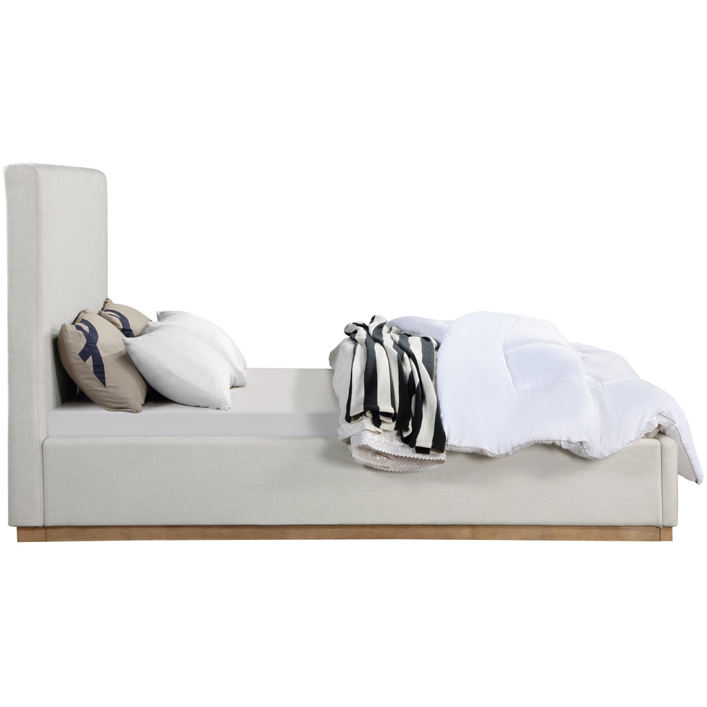 Give your bedroom a regal vibe when you add this Alfie linen textured fabric bed to the mix. The ultra tall headboard on this queen-size bed makes a bold impression from all angles and is covered in rich cream linen textured fabric that forms a pleasant contrast with the black finish solid wood base. The full flat design lets you easily use this bed without a box spring - a top mattress is all that's needed.
