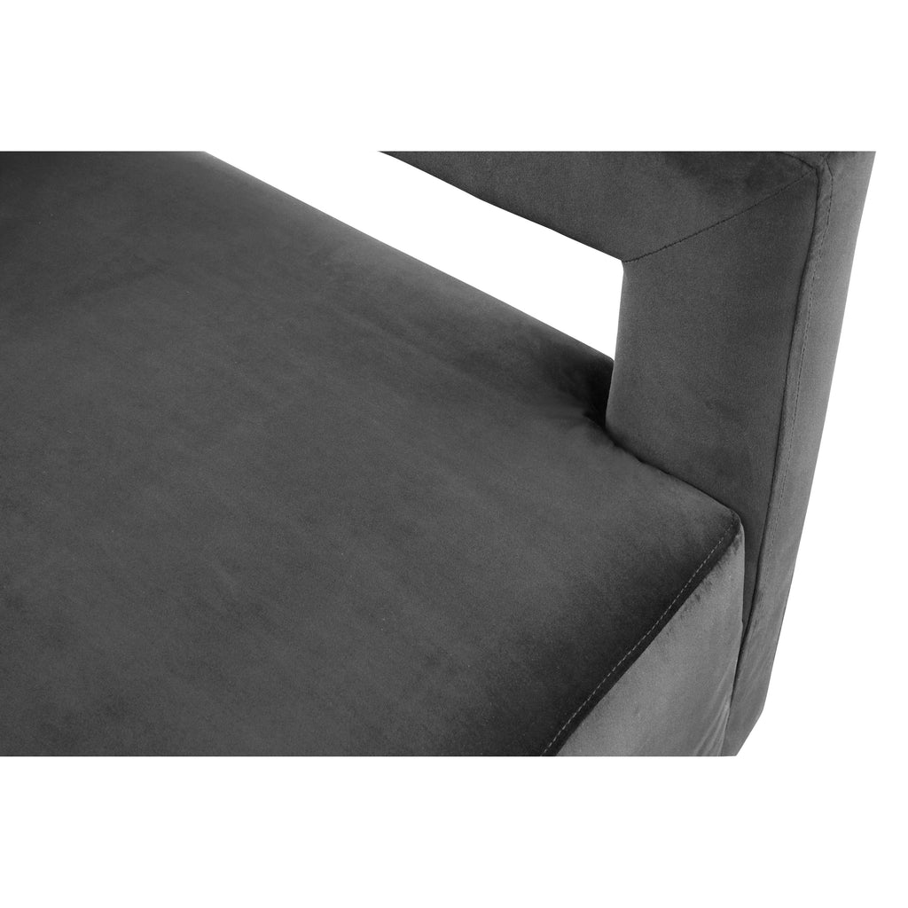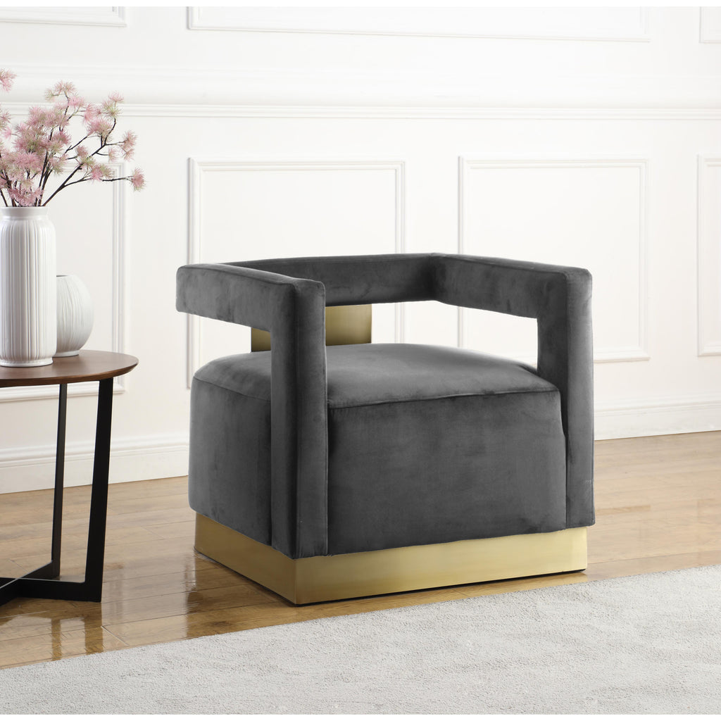 Liven up your living quarters with this unique Armani Grey Velvet Accent Chair from Meridian Furniture. Featuring a square frame design with right angle openings at the arms and back, this chair puts the "mod" in modern. Rich grey velvet upholstery gives the chair a soft, comfy texture that you'll want to get cozy with, and its gold steel base and back complements its dark upholstery while providing solid support. This chair is the perfect addition to any room in your contemporary home.