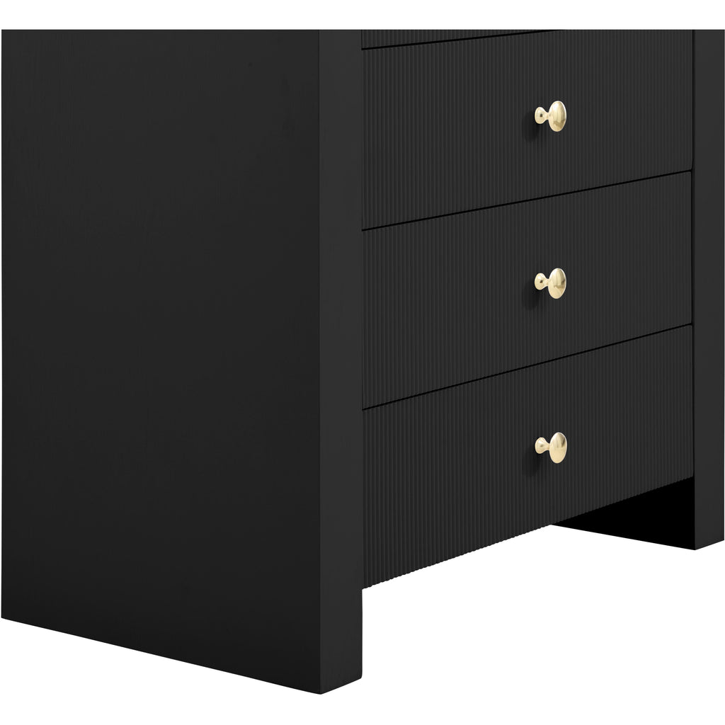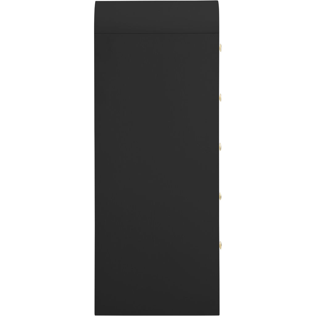 Make organizing a stylish affair when you bring home this Artisto chest. This beautiful chest features an elegantly eye-catching design with its rich wood veneer black finish and its textured drawer front designs. Five drawers give you oodles of room for storing items out of sight and out of mind, and the roomy drawers make sure that organizational power is at your fingertips. For versatility, both gold and chrome handles are included with the chest.