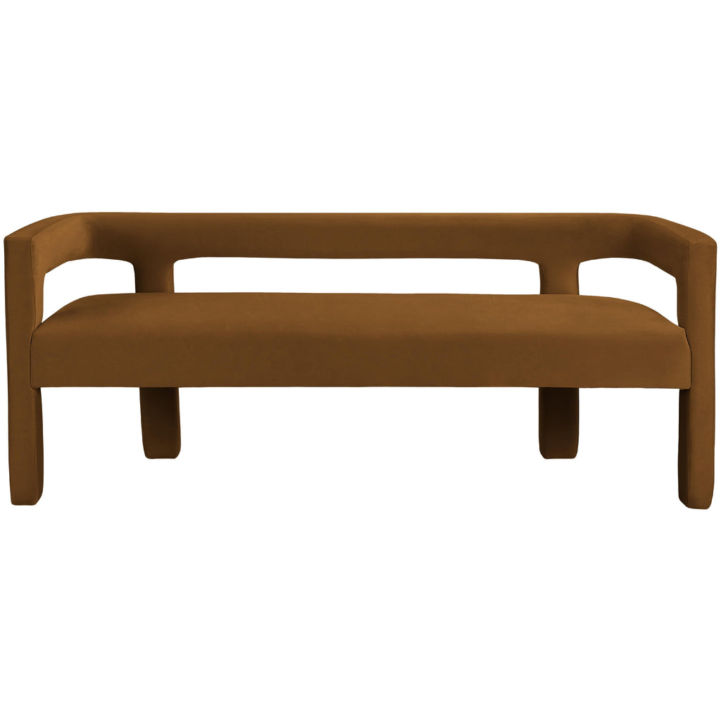 Flaunt your modish tastes with this Athena saddle velvet bench. Sophisticated by design, this dining room seating offers a sturdy frame made from high-quality materials and upholstered in soft welcoming velvet, so it always feels comfortable for family and guests. A low back provides a clean aesthetic while offering support as you wine and dine the night away. Pair it with other items in the same collection for a cohesive look.