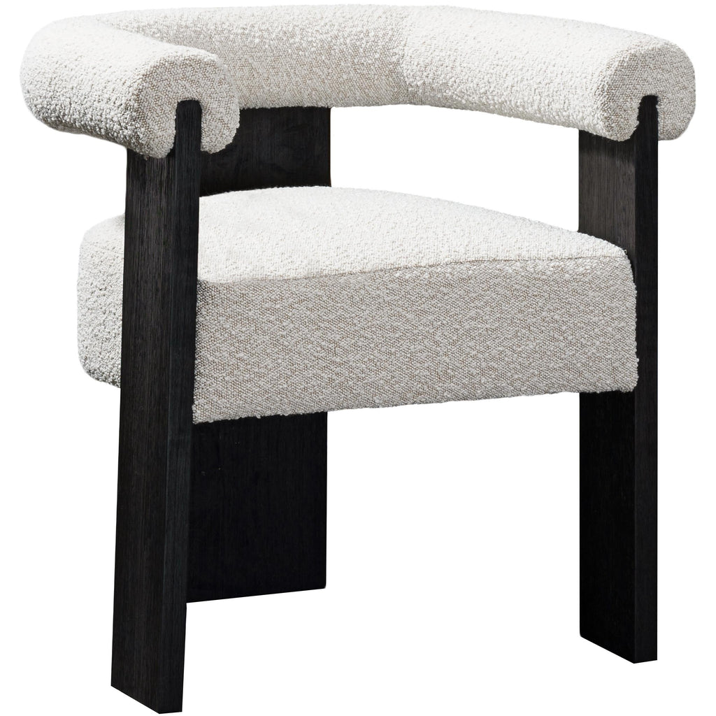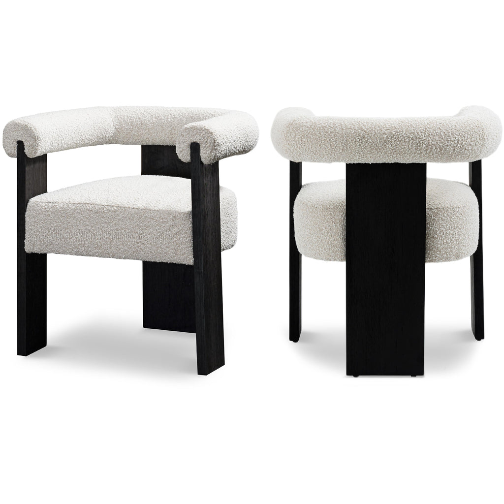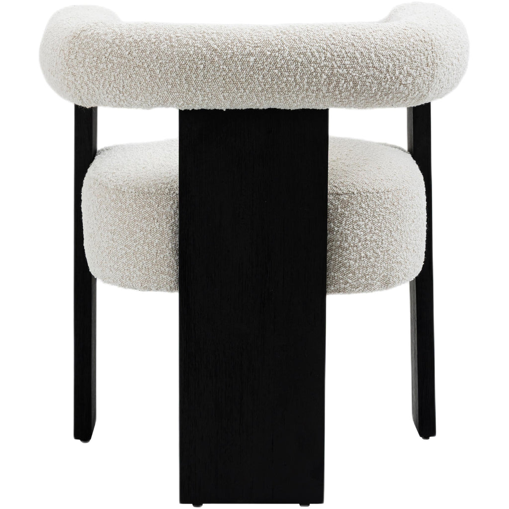 Prepare to fall in love with the elegant design of this Barrel dining chair. Designed to inject instant modern oomph into your space, this chair features a solid wood frame for sturdy durability and is outfitted with rich cream boucle fabric for a luxe finish. Pair this midcentury Barrel dining chair with a clear table to showcase its beauty from every angle and add a contemporary slant to your dining room group.