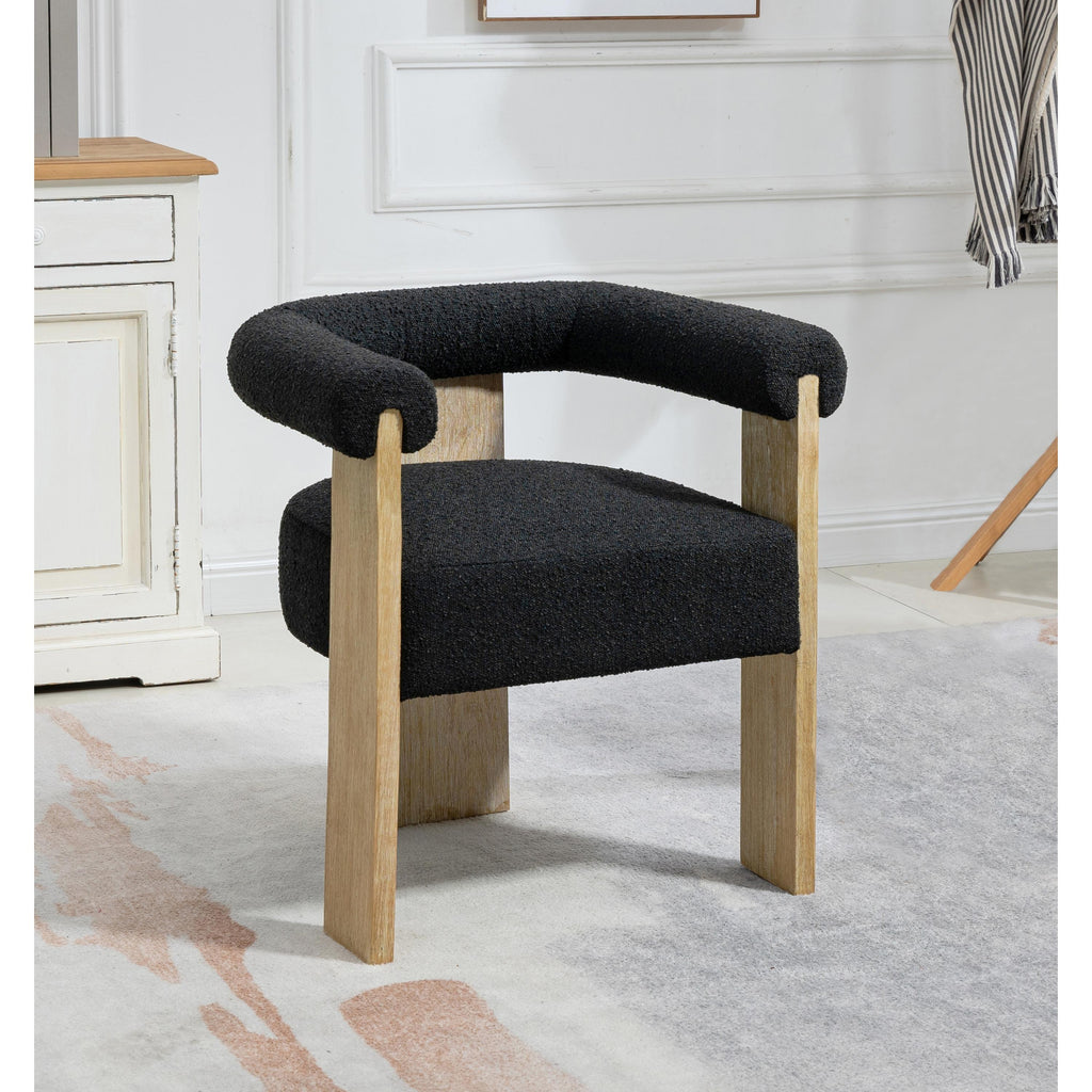 Prepare to fall in love with the elegant design of this Barrel dining chair. Designed to inject instant modern oomph into your space, this chair features a solid wood frame for sturdy durability and is outfitted with rich black boucle fabric for a luxe finish. Pair this midcentury Barrel dining chair with a clear table to showcase its beauty from every angle and add a contemporary slant to your dining room group.