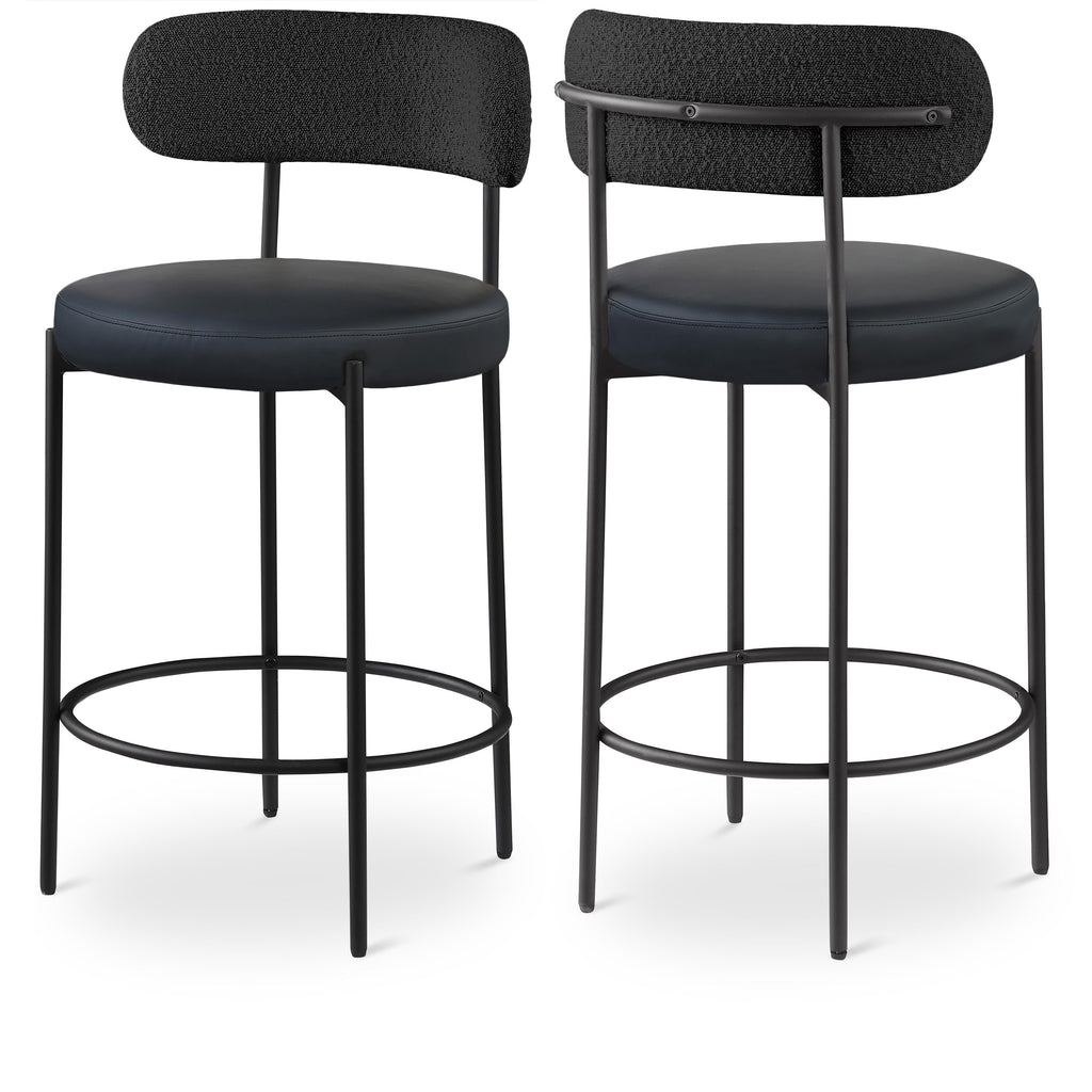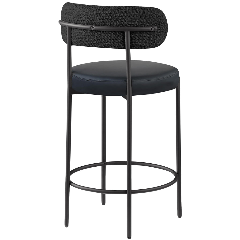 Make family, friends, and guests want to stay 'till closing time when they're seated on these Beacon vegan leather and boucle fabric bar stools/counter stools. These handsome stools are just the thing your kitchen counter or home bar is missing, with their ultra-modern design and beautiful look. The curved backs support the body while you sip a frosty cold one or nosh on some breakfast fare. A matte black metal frame gives the stools' design durability while the black vegan leather seat and boucle fabric back adds a touch of softness and comfort.