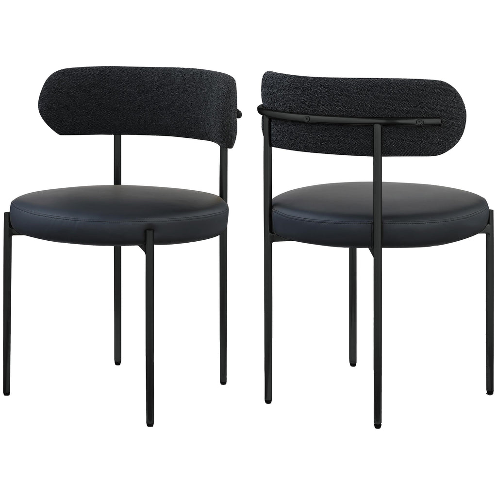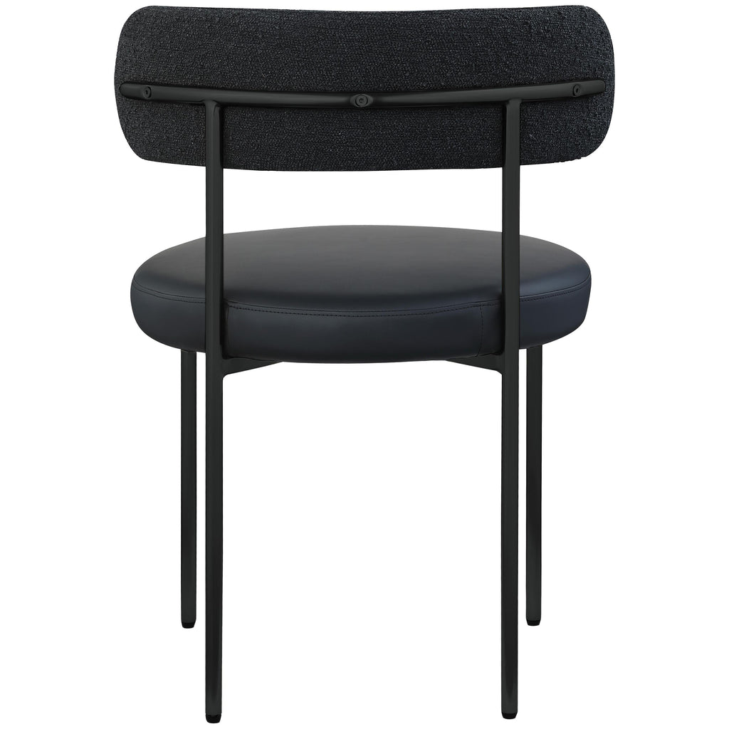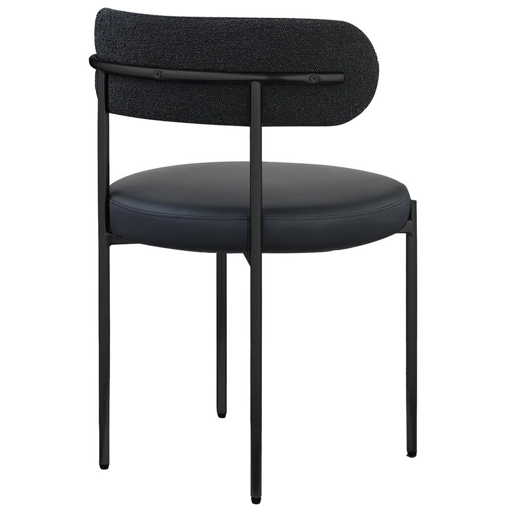 Bring modern comfort to the dining room with this Beacon black vegan leather and boucle fabric dining chair. Exquisitely designed to be one part utilitarian seat and one part art, this stylish chair turns heads from all angles. The seat comes upholstered in vegan leather for a luxe look while the back is covered in rich black boucle fabric. The iron metal frame features a matte black finish for an unmistakably modern look.