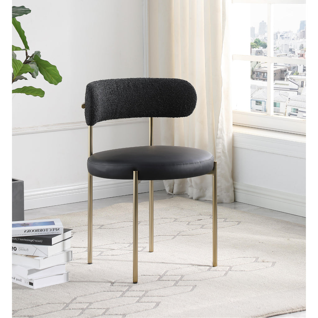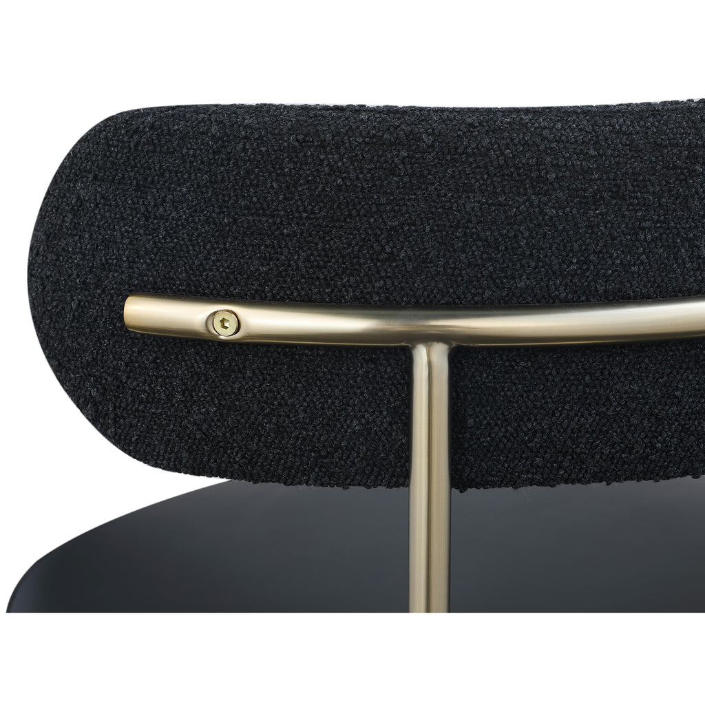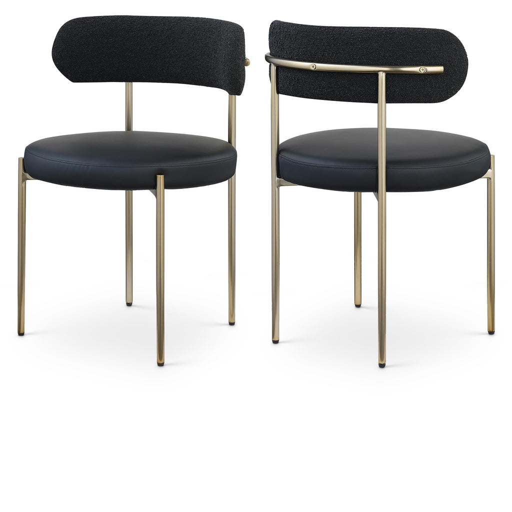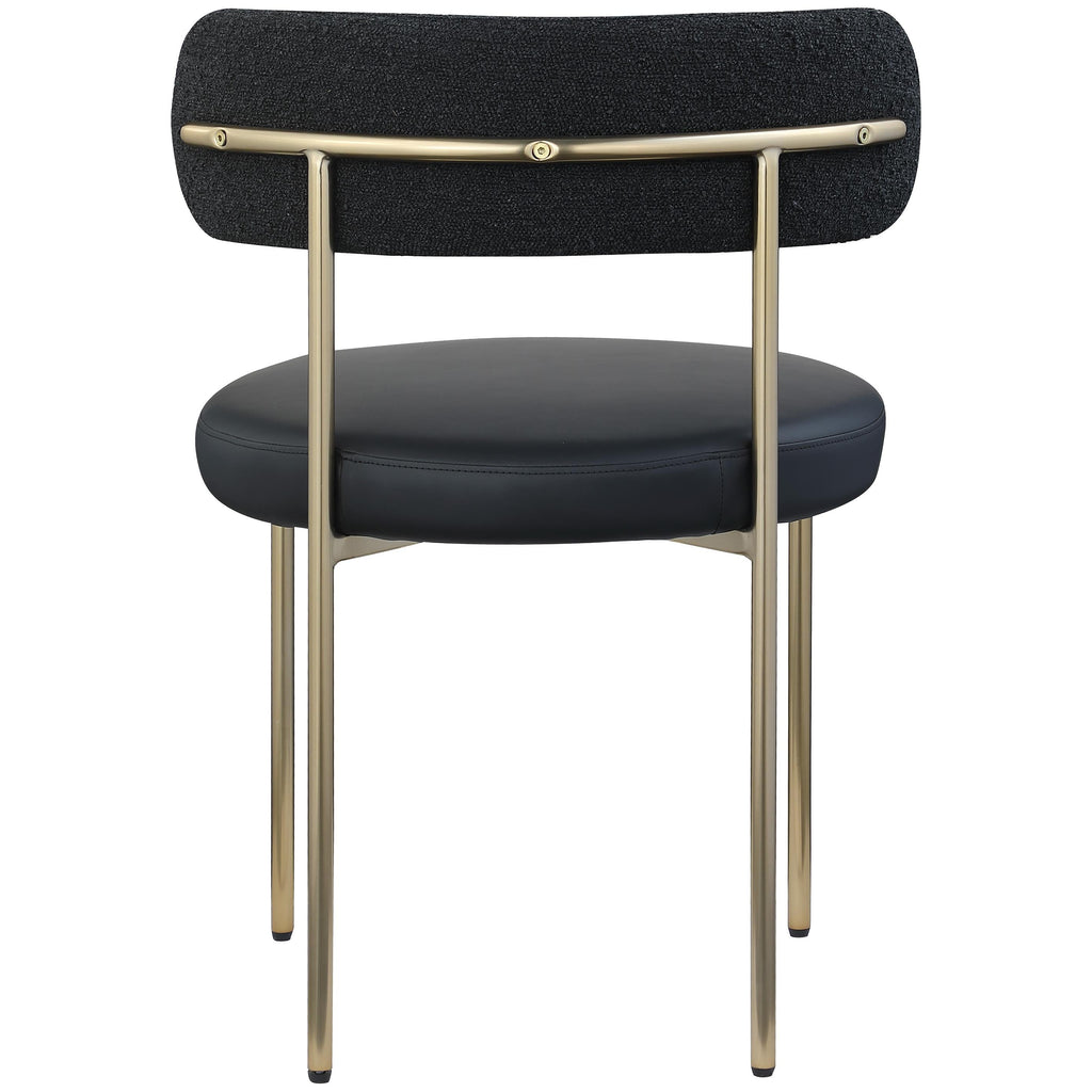 Give your dining room a modern boost with this Beacon vegan leather and boucle fabric dining chair. This pretty chair has the contemporary design elements you're looking for, from its curvy back to its thickly padded seat and brushed brass-finished metal frame. Black vegan leather provides the look of the real thing without the maintenance requirements.