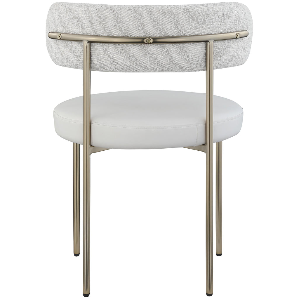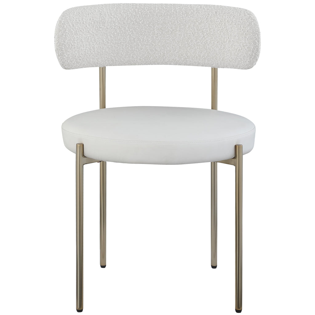 Give your dining room a modern boost with this Beacon vegan leather and boucle fabric dining chair. This pretty chair has the contemporary design elements you're looking for, from its curvy back to its thickly padded seat and brushed brass-finished metal frame. Cream vegan leather provides the look of the real thing without the maintenance requirements.
