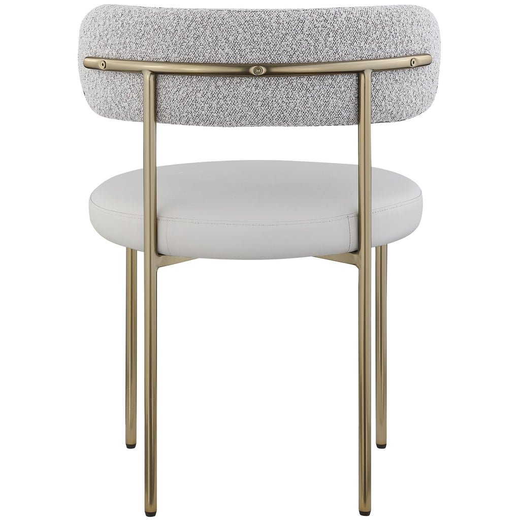 Give your dining room a modern boost with this Beacon vegan leather and boucle fabric dining chair. This pretty chair has the contemporary design elements you're looking for, from its curvy back to its thickly padded seat and brushed brass-finished metal frame. Taupe vegan leather provides the look of the real thing without the maintenance requirements.