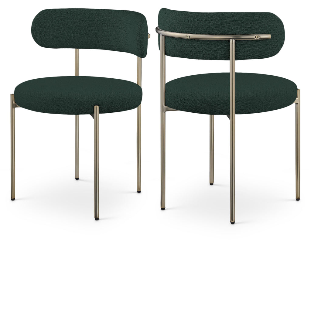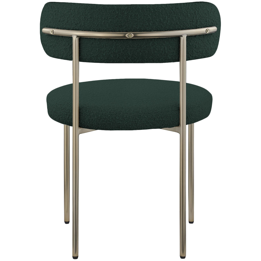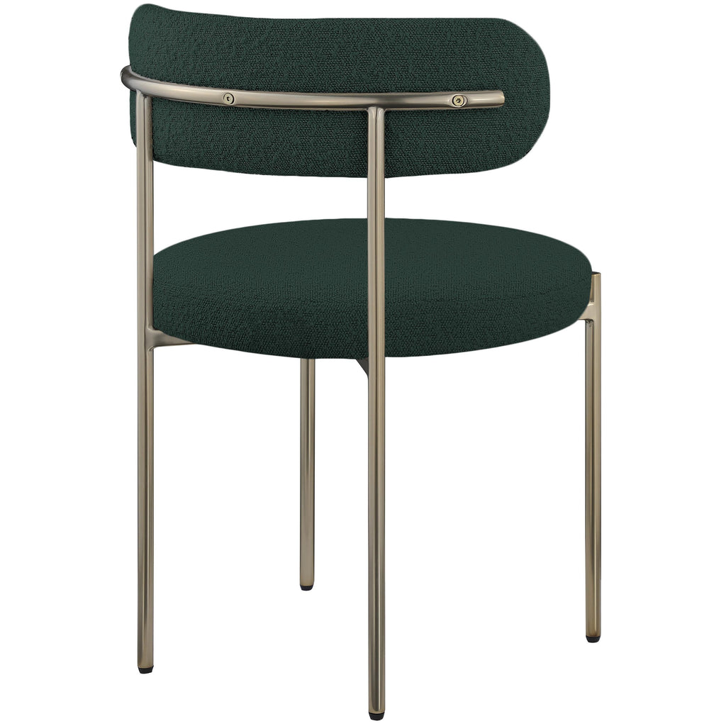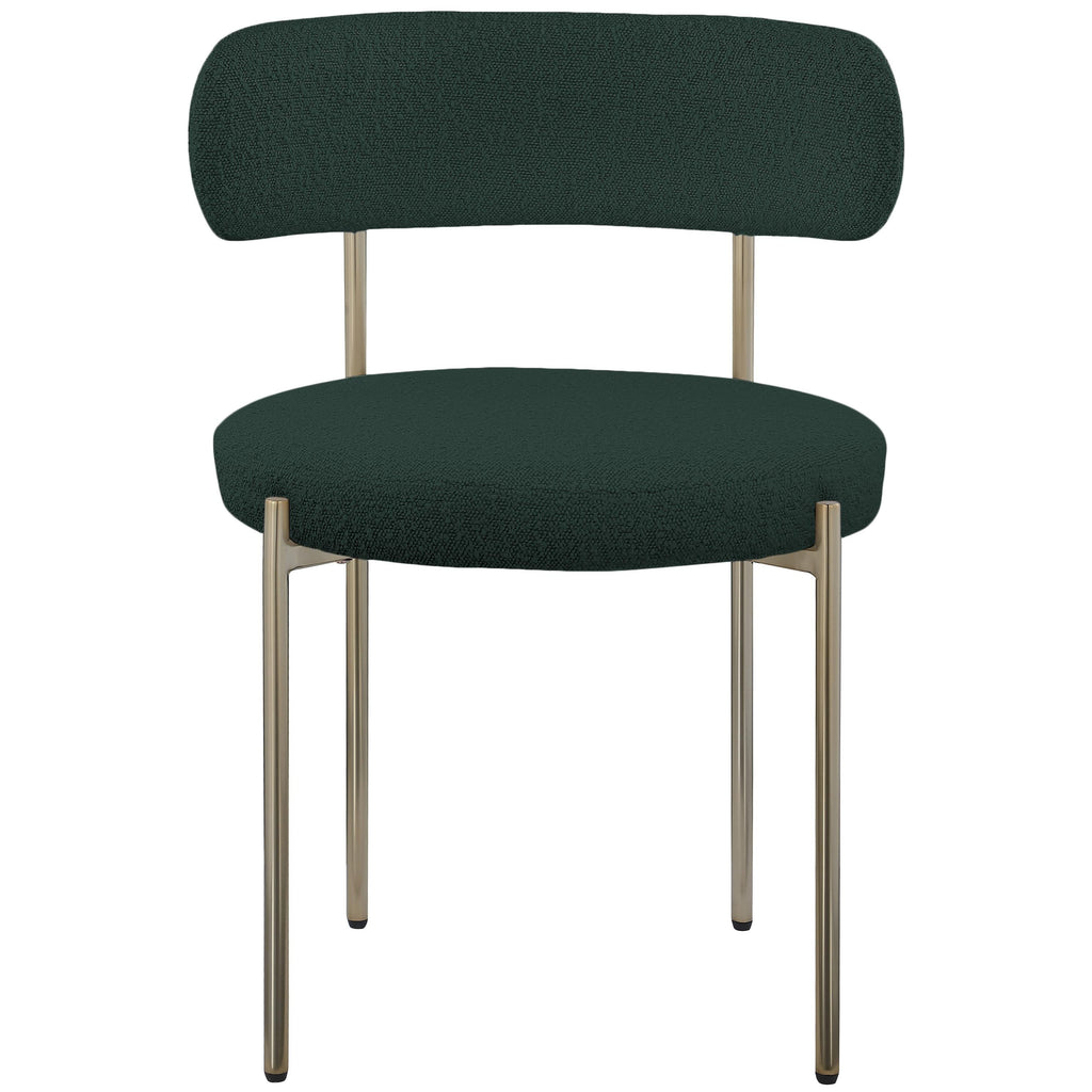 Your dining room gets a brand-new vibe when you bring home this Beacon boucle fabric dining chair. A rounded back makes sitting a pleasure, and the rich green boucle fabric is soft to the touch and feels great against the skin while being easy to maintain. An iron metal frame gives this dining room chair a durable touch, and the brushed brass finish adds a final touch of contemporary beauty. Pair this chair with the table of your choice for a dining room makeover.