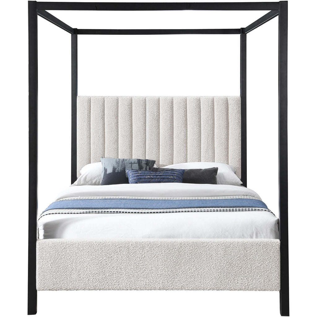 Immerse yourself in a haven of tranquility and refined design with the Kelly King-sized Boucle Fabric Bed. This captivating centerpiece seamlessly blends the rich texture of cream boucle fabric with a salt & pepper-colored undertone, creating a visual harmony that elevates your bedroom while fostering restful nights. The matte black iron metal frame canopy adds a touch of drama and elegance, transforming your space into a private sanctuary. Imagine the soft glow of fairy lights draped across the canopy, creating a magical ambiance perfect for unwinding after a long day or enjoying a cozy reading nook. This canopy provides not only a touch of privacy but also an opportunity to personalize your space and create a truly unique retreat.