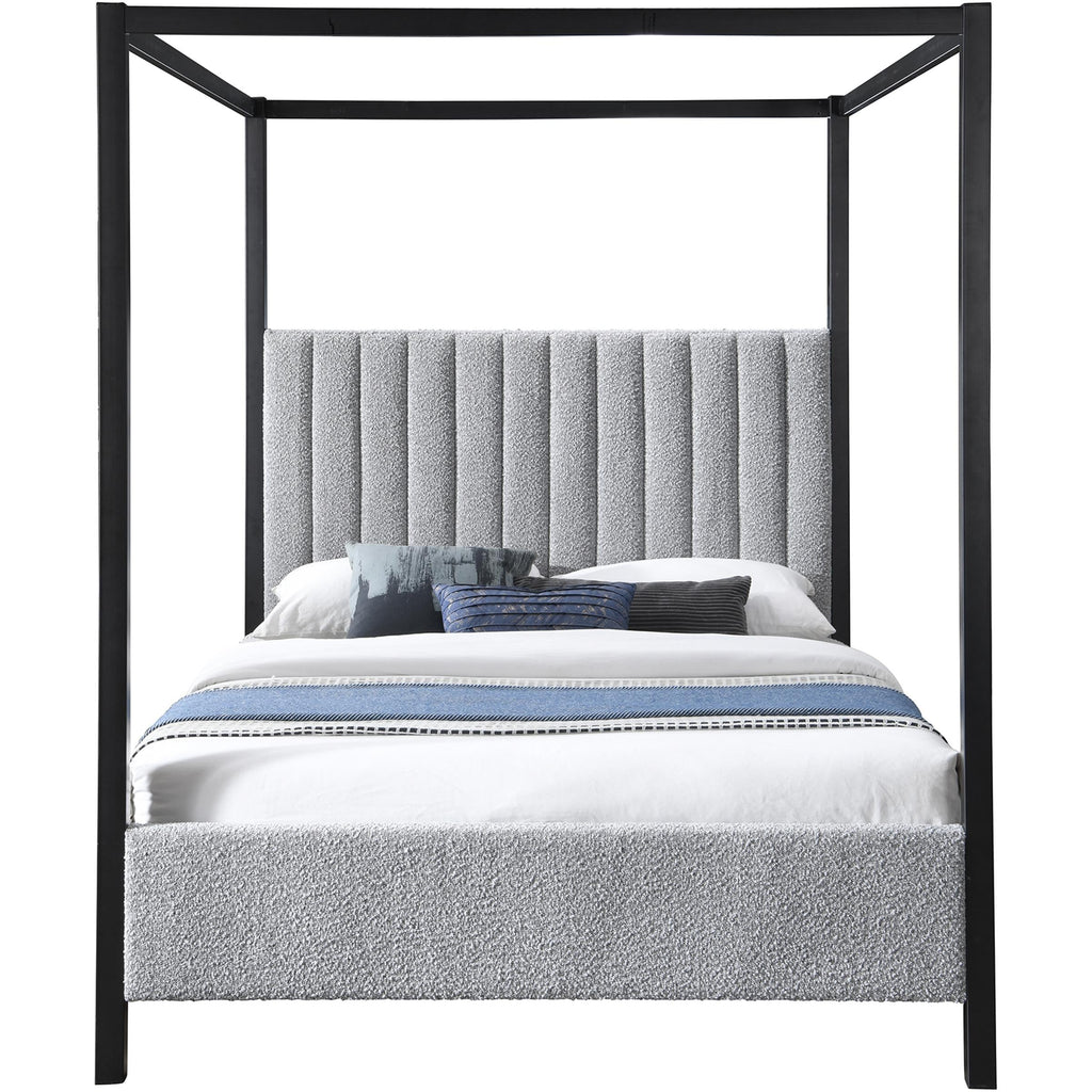 Immerse yourself in a haven of tranquility and refined design with the Kelly Queen-sized Boucle Fabric Bed. This captivating centerpiece seamlessly blends the rich texture of grey boucle fabric with a salt & pepper-colored undertone, creating a visual harmony that elevates your bedroom while fostering restful nights. The matte black iron metal frame canopy adds a touch of drama and elegance, transforming your space into a private sanctuary. Imagine the soft glow of fairy lights draped across the canopy, creating a magical ambiance perfect for unwinding after a long day or enjoying a cozy reading nook. This canopy provides not only a touch of privacy but also an opportunity to personalize your space and create a truly unique retreat.