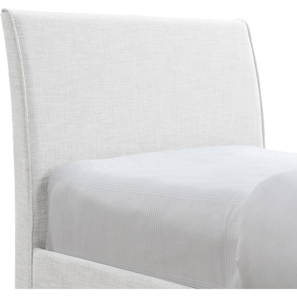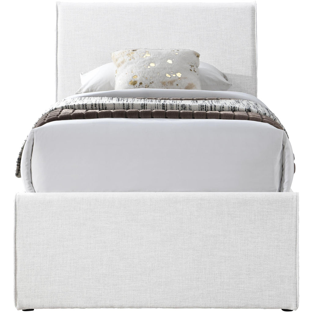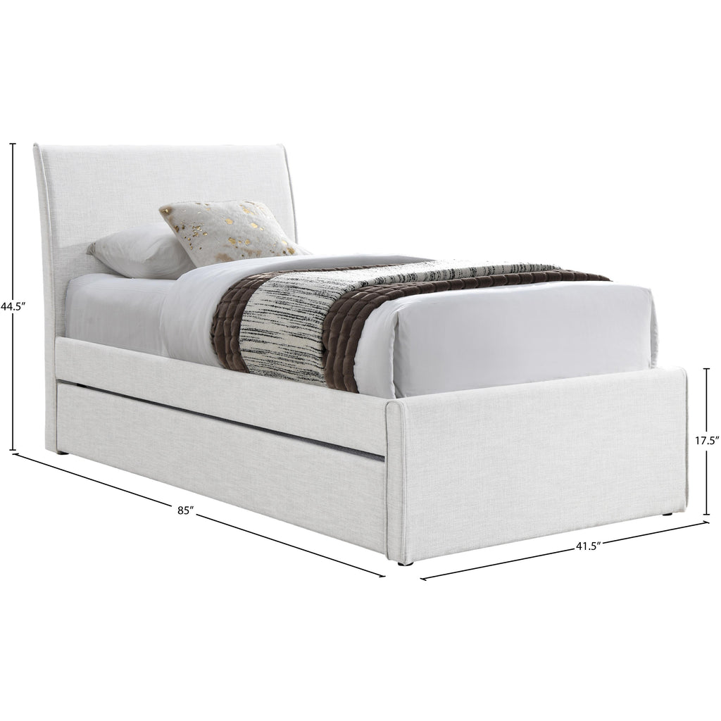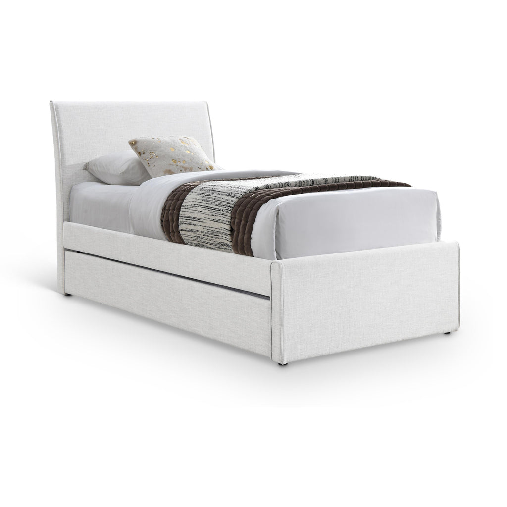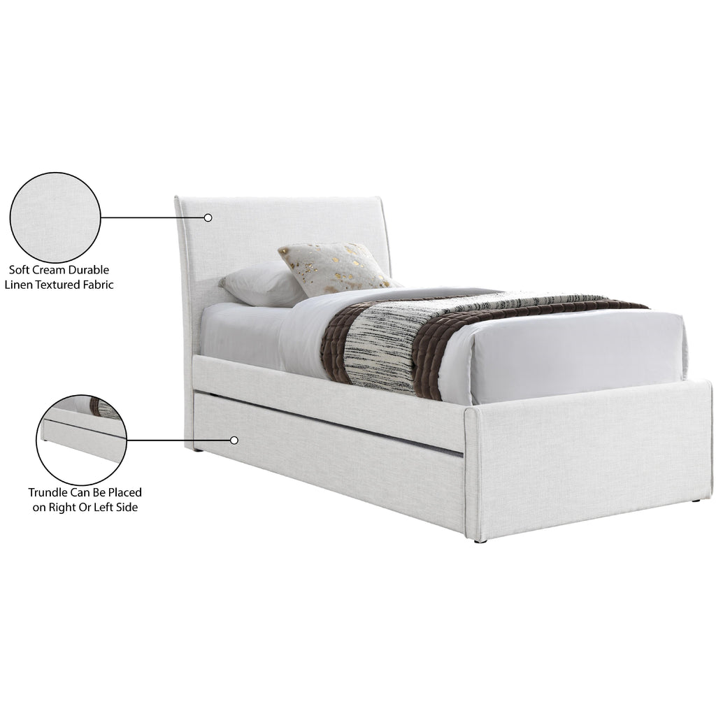 Add extra sleeping space or storage with this Myles cream linen textured fabric twin trundle bed. Upholstered in soft, durable linen textured fabric, it features a rolling trundle that accommodates up to an 8" thick twin mattress. The trundle's versatility allows it to be placed on either the right or left side, making it ideal for teen, tween, or guest bedrooms and dorm rooms. Practical and stylish, this trundle bed maximizes functionality while enhancing the aesthetic appeal of your room and maximizing space for sleepovers and overnight guests.