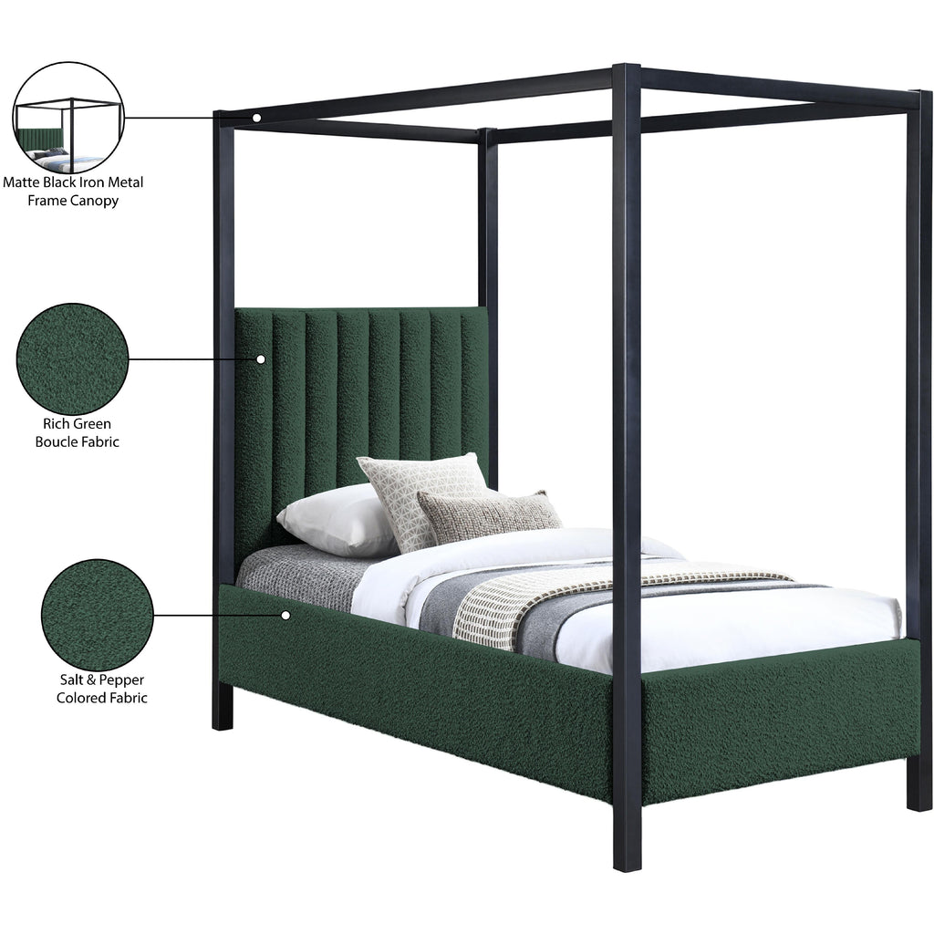 Immerse yourself in a haven of tranquility and refined design with the Kelly Twin-sized Boucle Fabric Bed. This captivating centerpiece seamlessly blends the rich texture of green boucle fabric with a salt & pepper-colored undertone, creating a visual harmony that elevates your bedroom while fostering restful nights. The matte black iron metal frame canopy adds a touch of drama and elegance, transforming your space into a private sanctuary. Imagine the soft glow of fairy lights draped across the canopy, creating a magical ambiance perfect for unwinding after a long day or enjoying a cozy reading nook. This canopy provides not only a touch of privacy but also an opportunity to personalize your space and create a truly unique retreat.