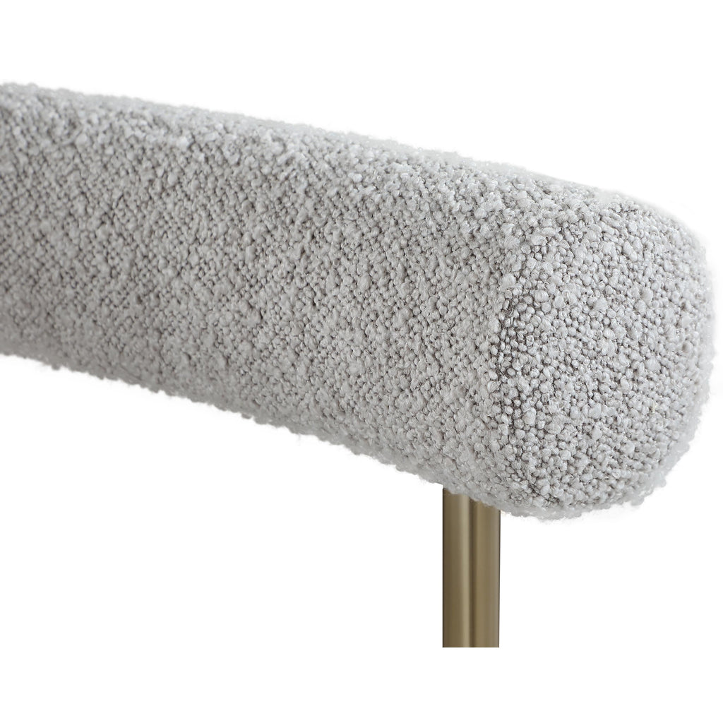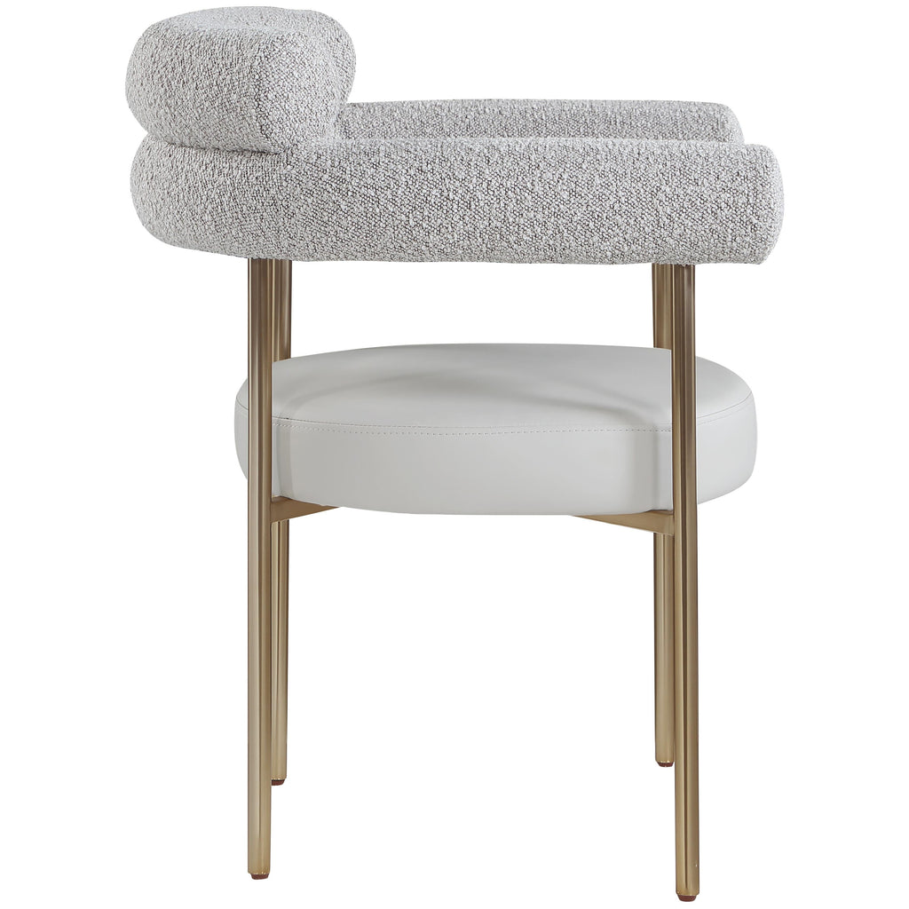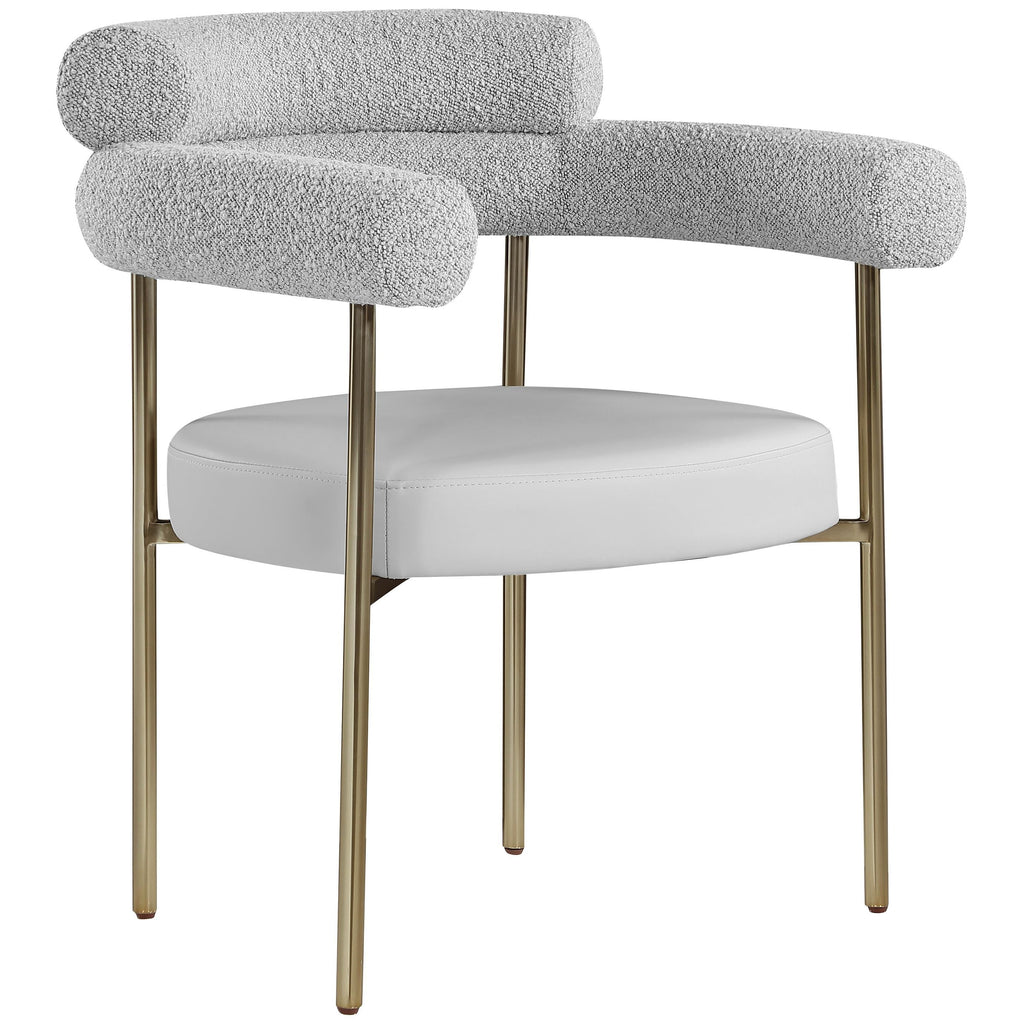 Comfort comes to mealtime with this Blake boucle fabric and vegan leather dining chair. This lovely chair is just the right choice for your modern dining room, with its curved back that cradles you in comfort while you wine and dine the night away. A thickly padded soft lack vegan leather seat lends this chair a sleek, upscale look while ensuring its ongoing performance and beauty. The chair's brushed brass finish protects its all-metal iron frame.