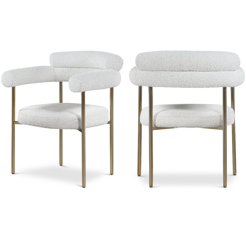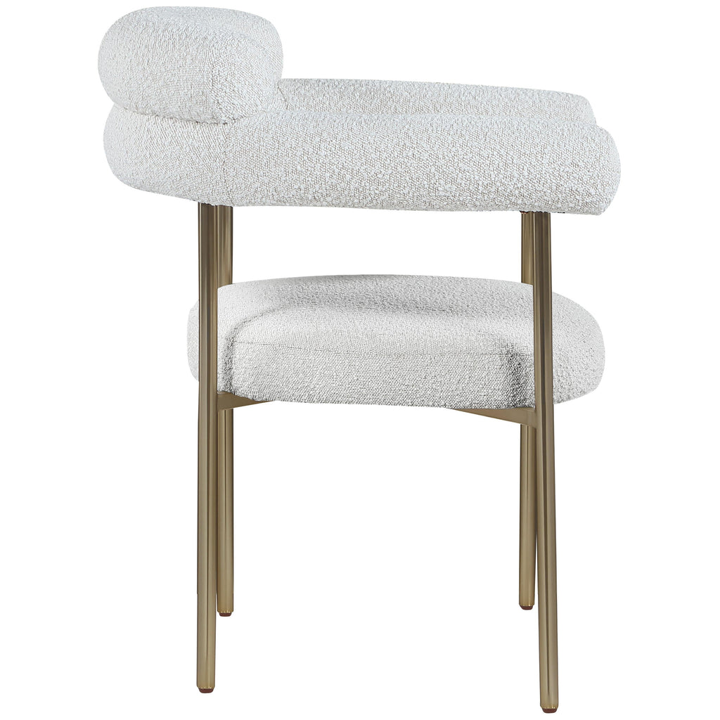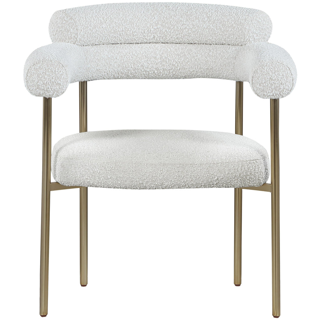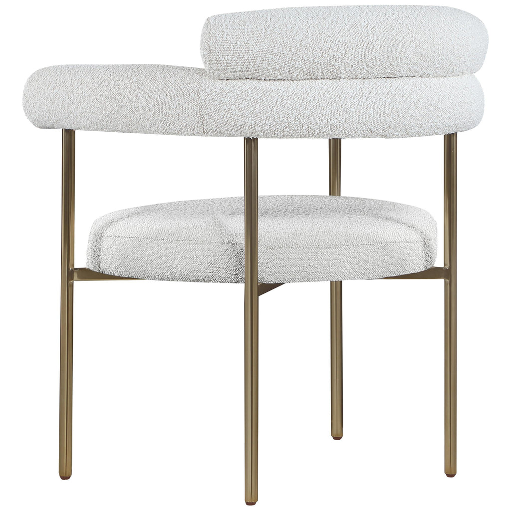 Comfort comes to mealtime with this Blake boucle fabric dining chair. This lovely chair is just the right choice for your modern dining room, with its curved back that cradles you in comfort while you wine and dine the night away. A thickly padded soft cream boucle fabric seat lends this chair a sleek, upscale look while ensuring its ongoing performance and beauty. The chair's brushed brass finish protects its all-metal iron frame.