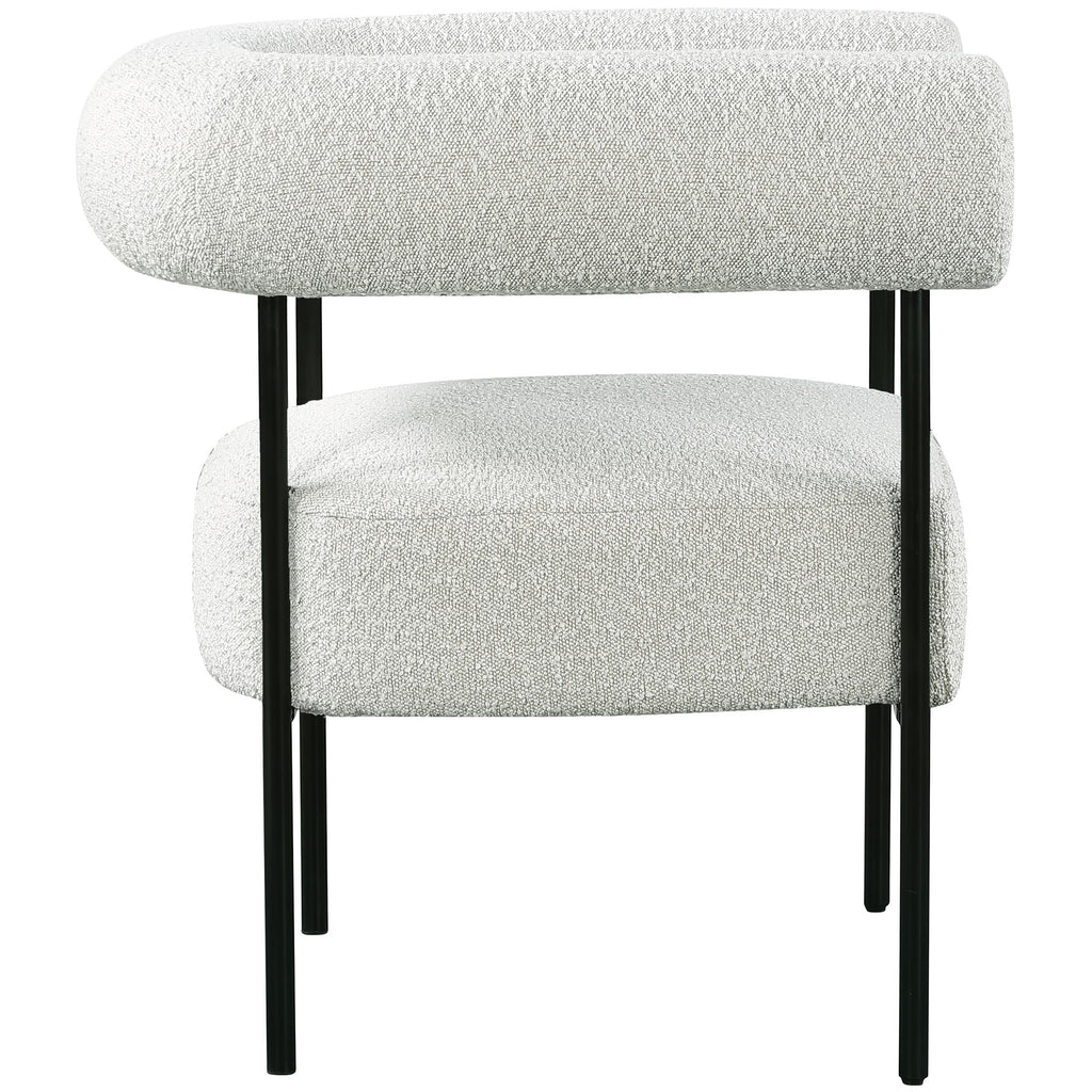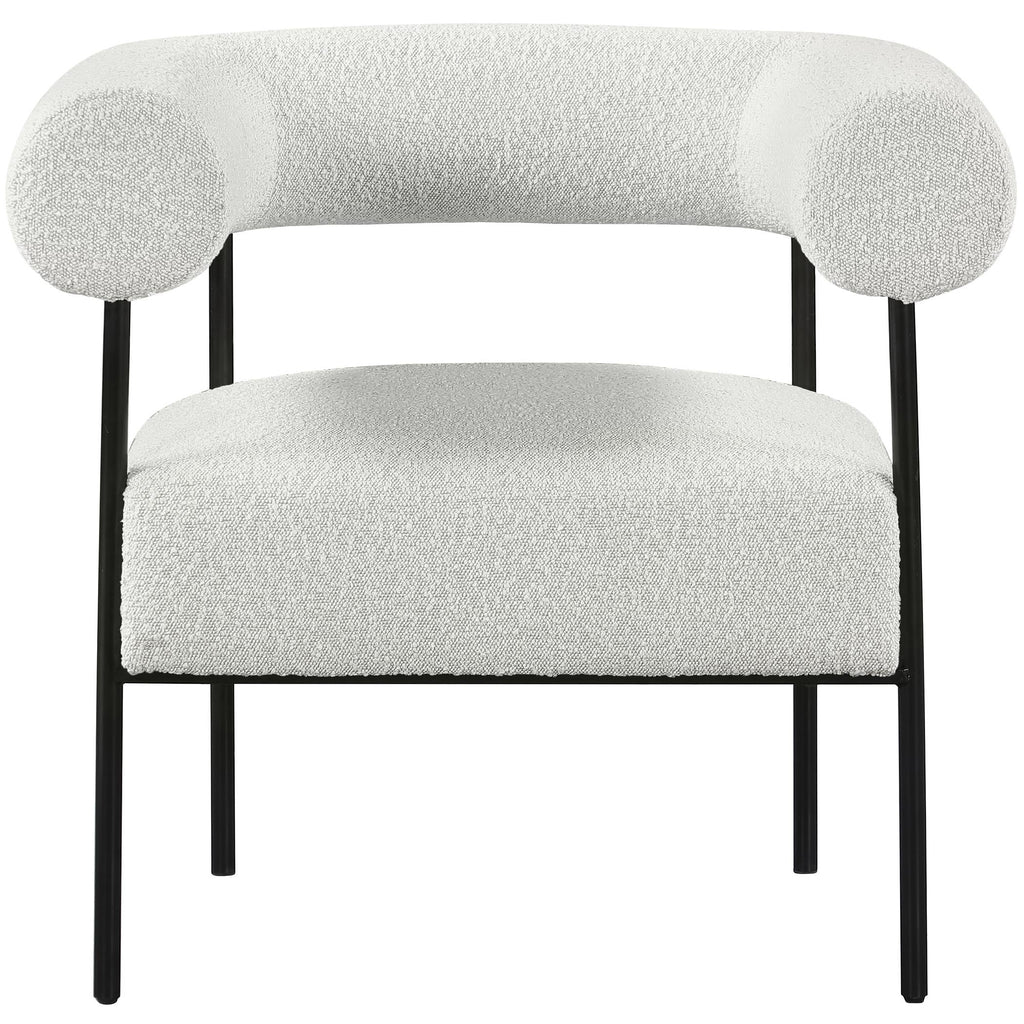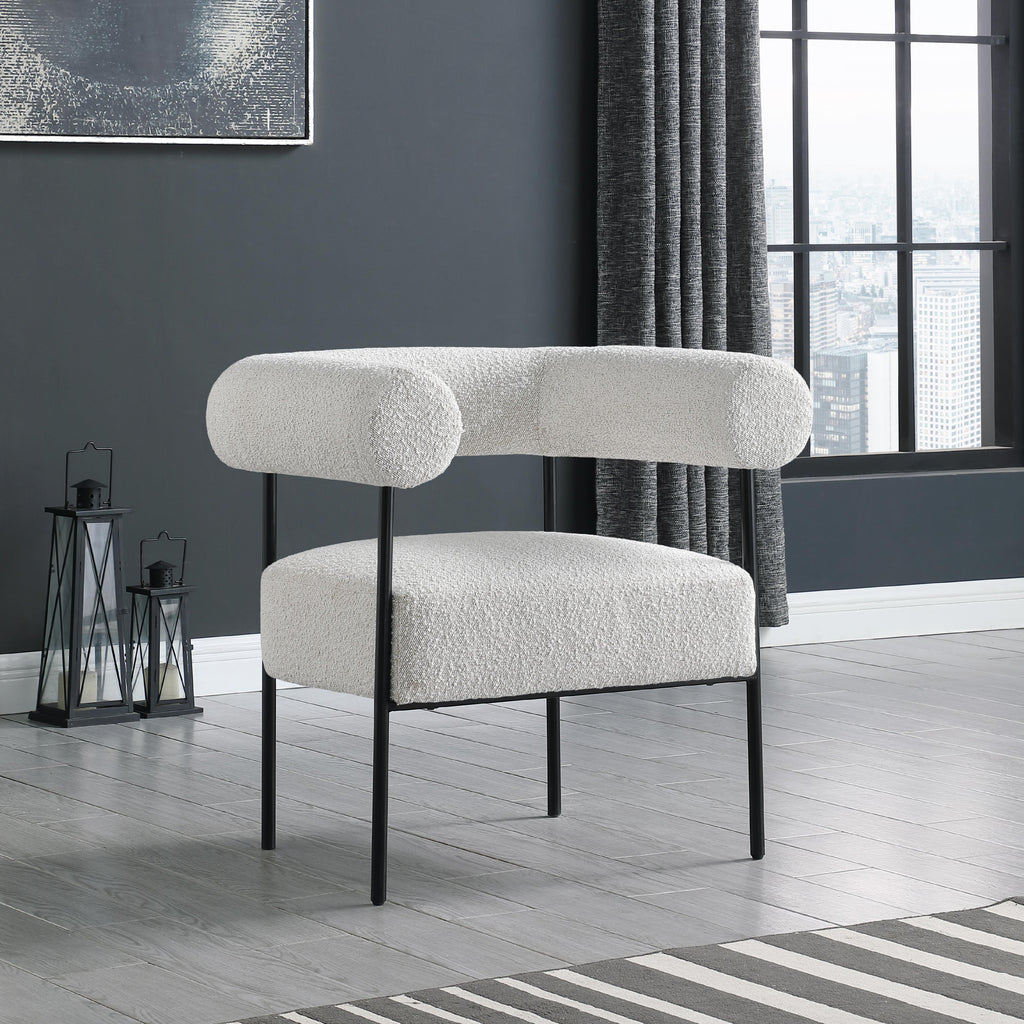 Modernize your home with this Blake accent chair. Featuring rich cream boucle fabric and a matte black metal frame, its contemporary design is sure to catch the eye of all your house guests. Crafted from a mixture of iron and foam, this accent chair is sturdy enough to seat just about anyone. Its curved back provides a comfortable resting place for your spine, and its thick foam cushion gives you a plush place to sit.