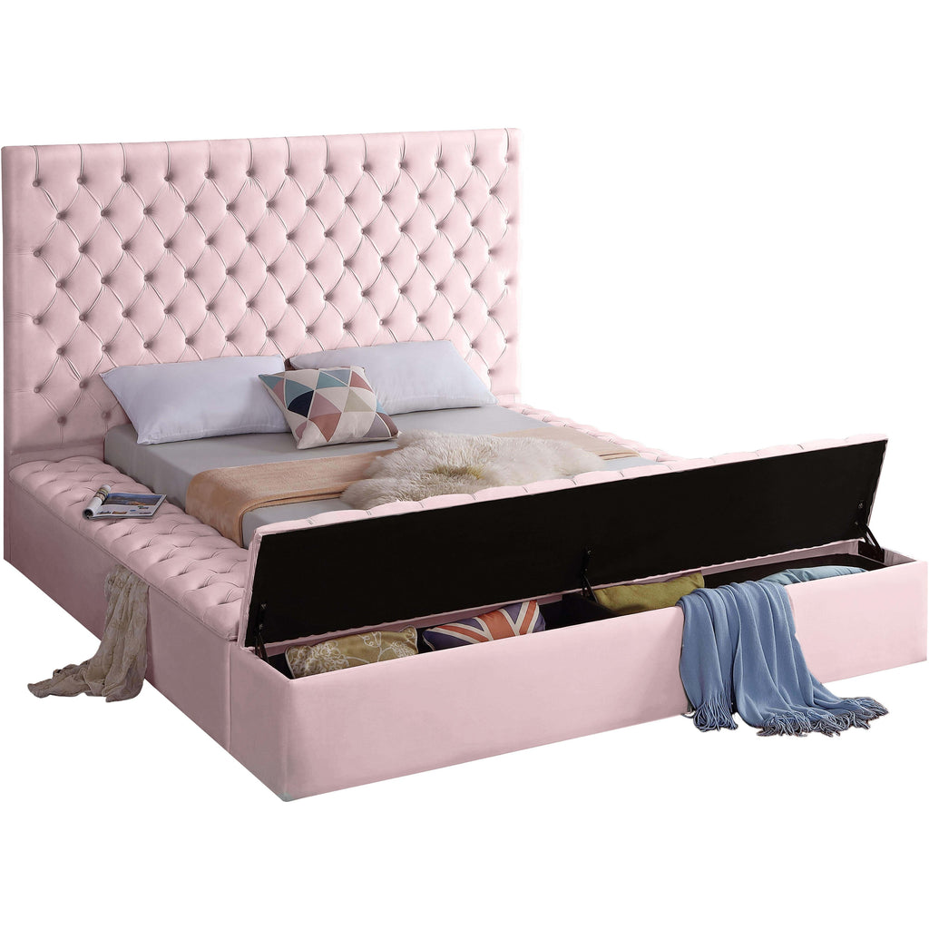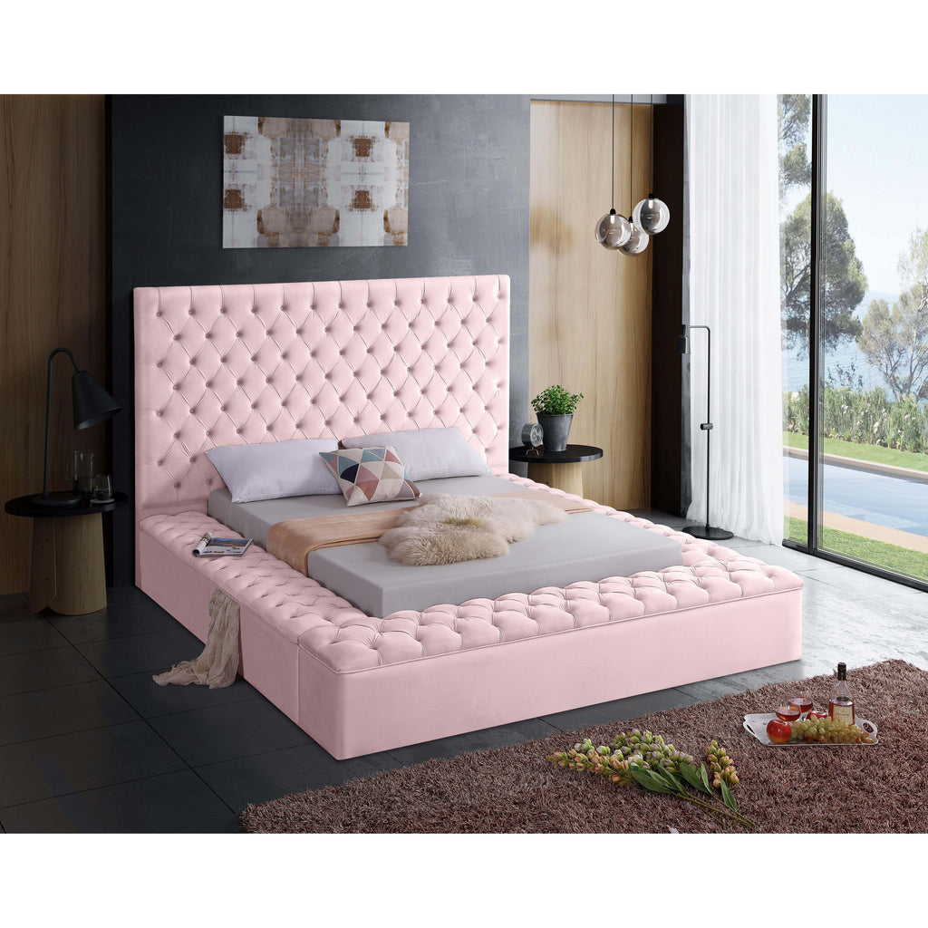 Extend elegance to the bedroom with this Bliss Pink velvet bed. This bed has a rich look, with deeply tufted upholstery along its upper platform perimeter and headboard, ensuring that it is a good fit in modern bedroom themes. Storage rails and footboard are included to ensure maximum versatility, and the bed comes with full slats, so you can use it without a box spring. The pink velvet fabric used in its design makes it easy to integrate alongside other furnishings.