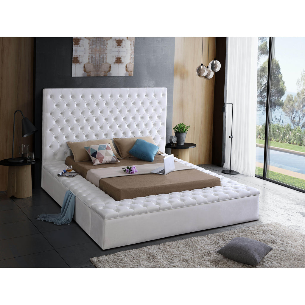 Extend elegance to the bedroom with this Bliss white velvet bed. This bed has a rich look, with deeply tufted upholstery along its upper platform perimeter and headboard, ensuring that it is a good fit in modern bedroom themes. Storage rails and footboard are included to ensure maximum versatility, and the bed comes with full slats, so you can use it without a box spring. The white velvet fabric used in its design makes it easy to integrate alongside other furnishings.
