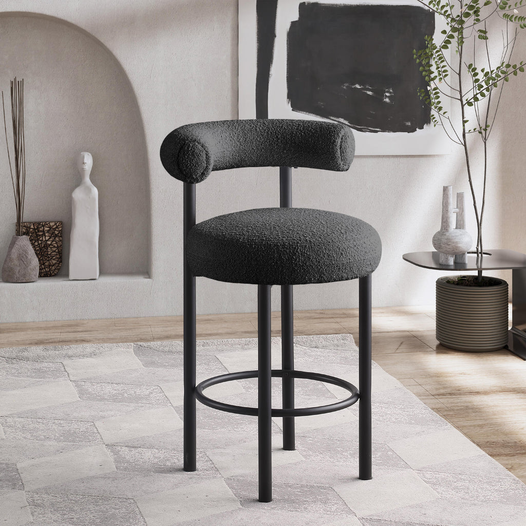 Give your kitchen counter or home bar a fresh face with this Bordeaux boucle fabric stool. This stool features rich black boucle fabric upholstery on the curved back and seat, so guests sit comfortably for pancake breakfasts or their favorite spirits. The iron metal frame is durable, tough, and sturdy, so it holds up to long-term enjoyment by family and friends. A matte black finish lends the stool an uber modern feel.